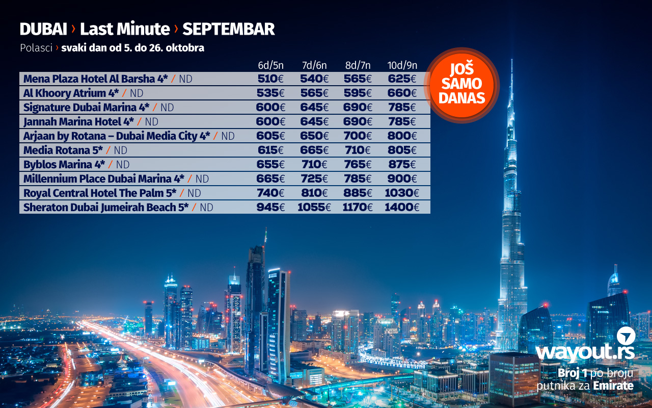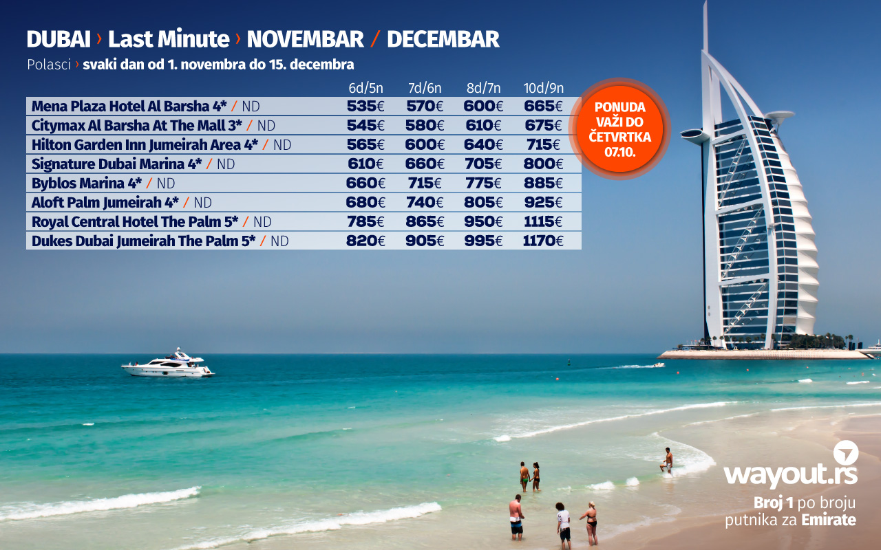 Обзиром на то да је у Дубаију 01. октобра почео највећи светски сајам EXPO 2020 који ће трајати 6 месеци, у Wayout понуди можете наћи и поласке у новембру и децембру ове године, а ускоро се очекује понуда за поласке у јануару и фебруару, као и пролећне поласке у марту и априлу наредне године.