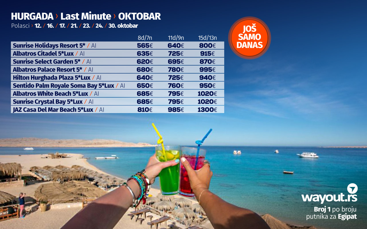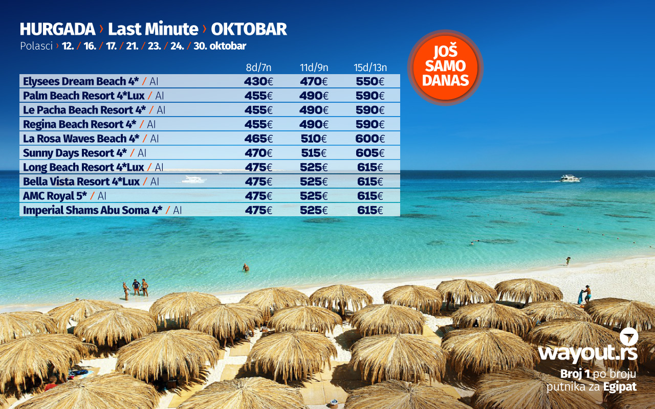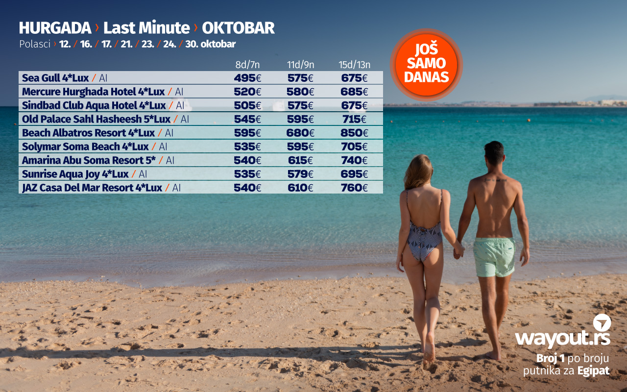 ИСКОРИСТИТЕ НОВУ LAST MINUTE ПОНУДУ ЗА ПОЛАСКЕ У ОКТОБРУ И СПЕЦИЈАЛНУ ПОНУДУ ЗА ПОЛАСКЕ У НОВЕМБРУ ЗА ХУРГАДУ