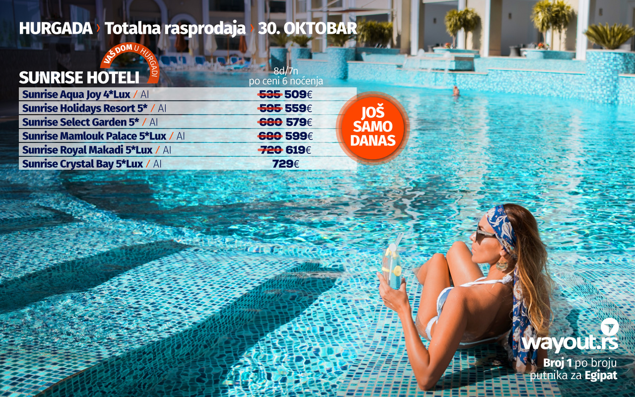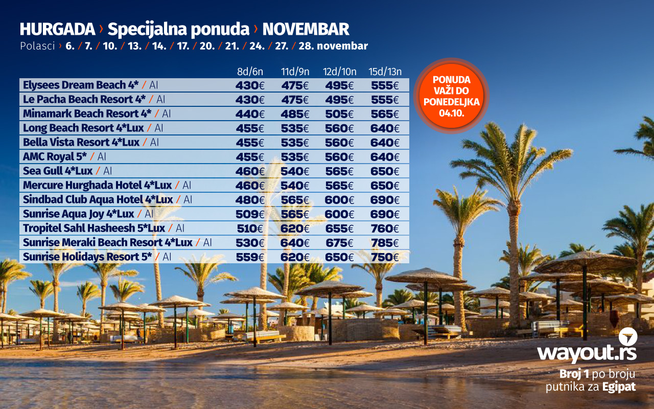 Такође, посебно бисмо напоменули и новитет у Wаyоут понуди, а то су аранжмани за Мини одмор у Хургади, базирани на 8 дана / 7 ноћења у октобру, са поласцима 9. / 16. / 23. / 30. октобра у сарадњи са националном авио компанијом Аир Сербиа којој дугујемо велику захвалност на беспрекорној сарадњи, а пре свега су ови аранжмани намењени путницима који желе на кратко да оду из града или једноставно немају довољно слободних дана од годишњег одмора.