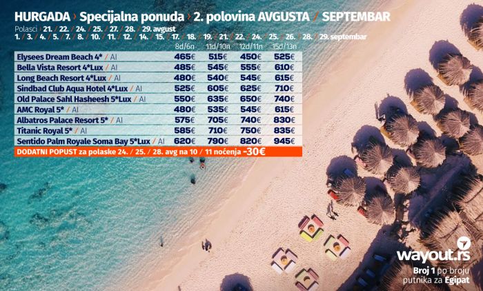 Уколико још увек нисте стигли да резервишете своје летовање, без много размишљања, дефинитвно, најсигурнији и најповољнији избор овог лета је Хургада и одмор на прелепим плажама Црвеног мора, а за све оне који би да што пре побегну од свакодневних обавеза, смо спремили неодољиве понуде за другу половину августа, септембар, октобар, а пошто лето у Хургади траје током целе године, спремили смо и Ultra First Minute понуде за новембар и децембар, са најповољнијим ценама аранжмана до сада. Још један разлог да се одлучите за путовање у Хургаду овог лета је и тад што је Египат признао вакцинацију, самим тим сви вакцинисани путници могу на своје летовање да крену без негативног ПЦР теста, а уколико нисте вакцинисани, ПЦР тестирање можете обавити у Србији или при слетању у Хургаду, као што су путници већ навикли.