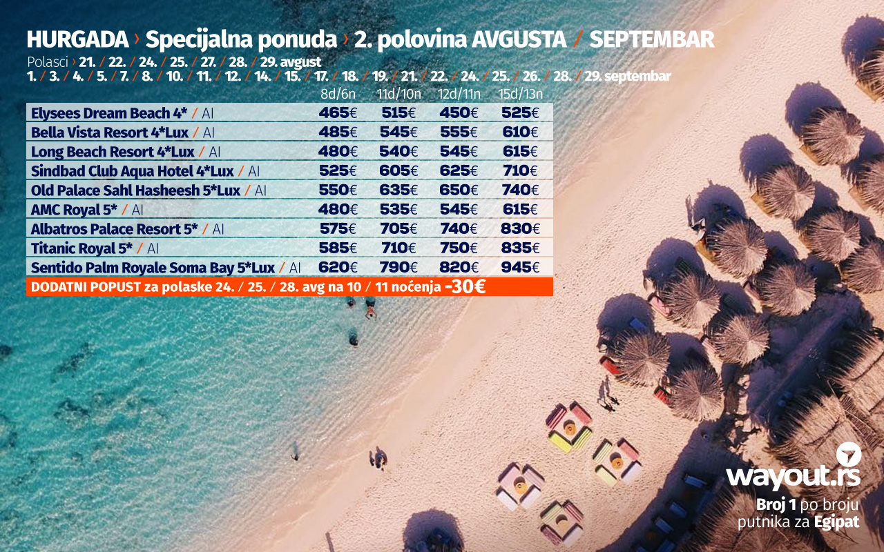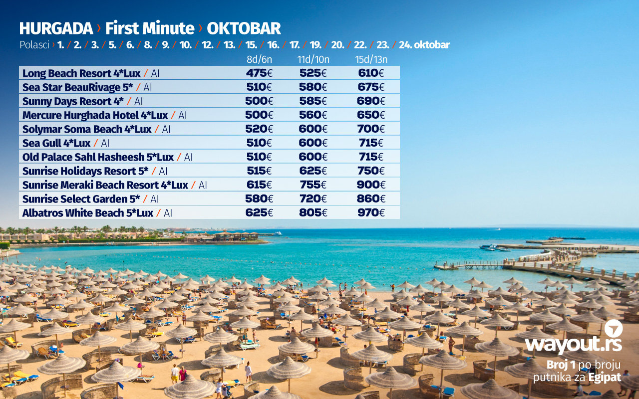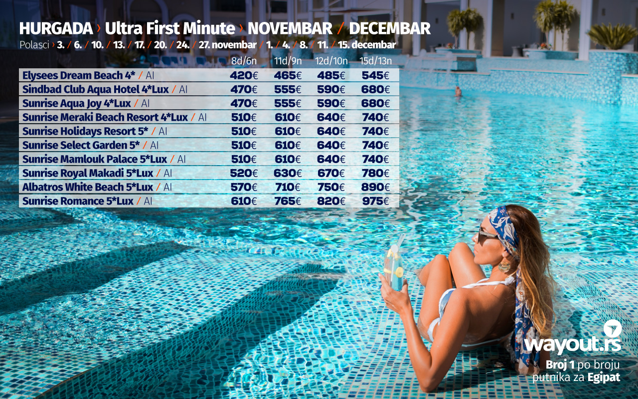 Један од показатеља да је Хургада једна од најсигурнијих туристичких дестинација, као и искуства путника који су прошле године, у време пандемије путовали у Египат, јесте то да су поједини хотели већ изашли са понудом за поласке у новембру и децембру, а ми смо за све наше путнике издвојили најтраженије хотеле по специјалним Ultra First Minute ценама, а обзиром да је тражња за путовањима у Хургаду огромна, саветујемо да на време резервишете своје место и без стреса сачекате своје путовање у новембру или децембру.