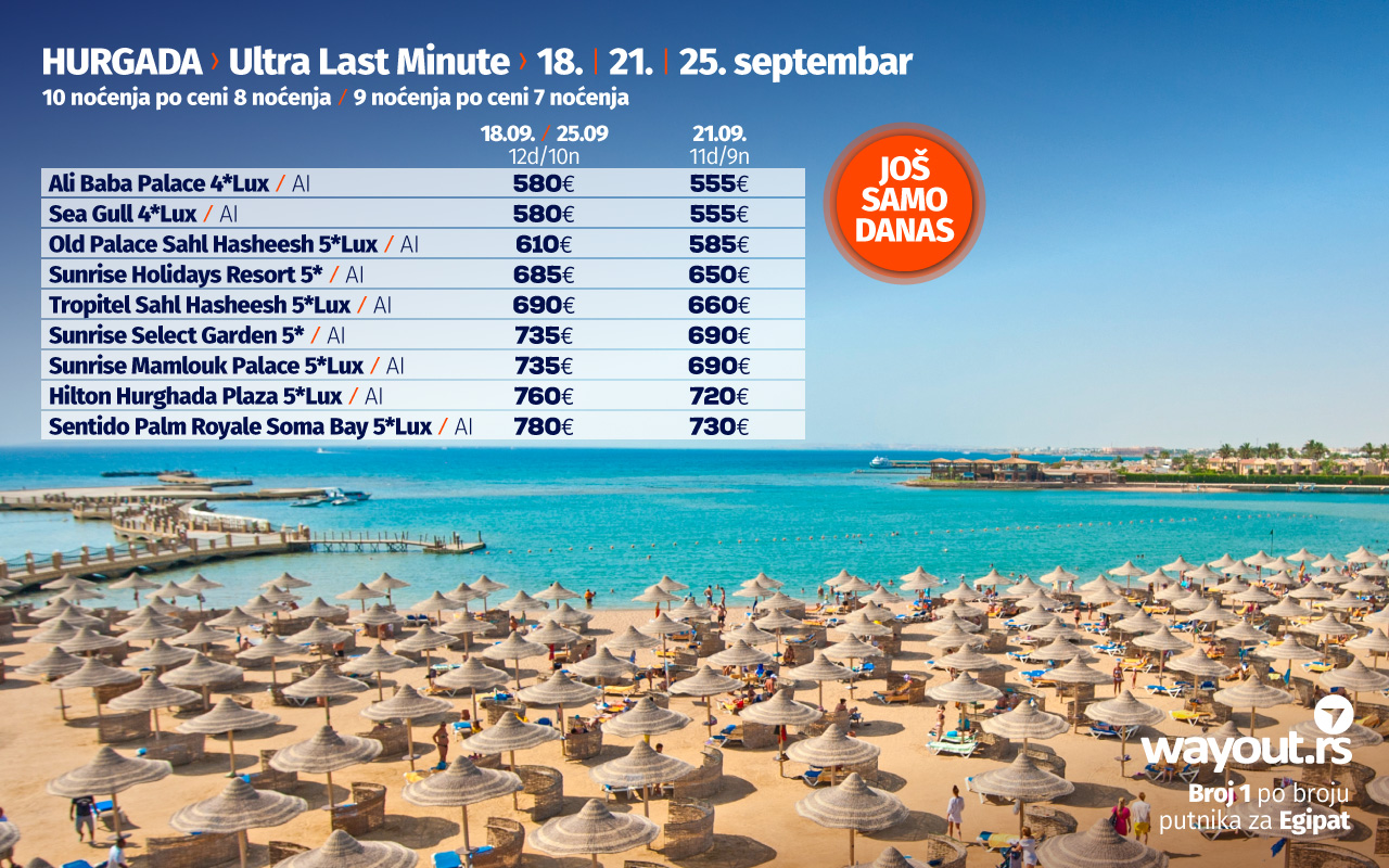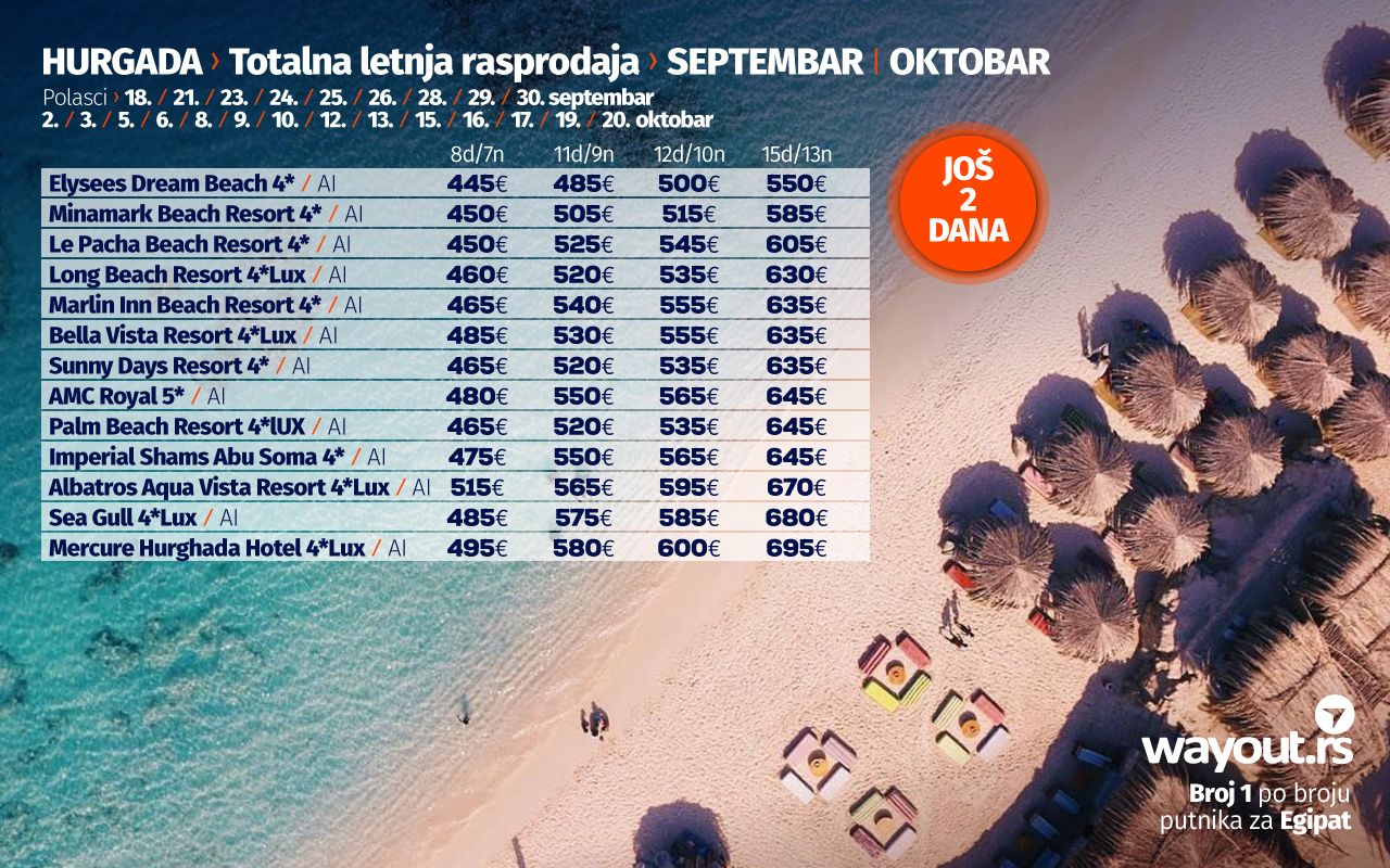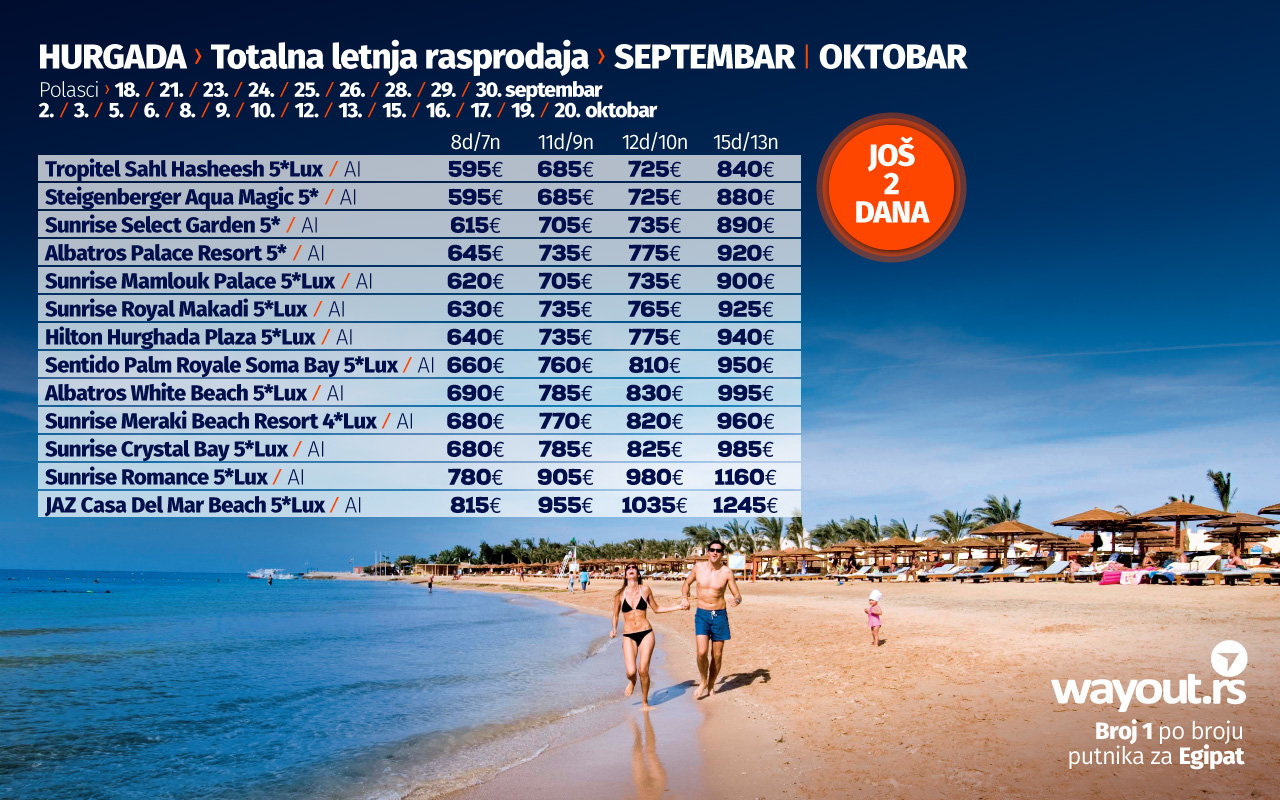 Уколико још увек нисте стигли да резервишете своје путовање, без много размишљања, дефинитвно, најсигурнији и најповољнији избор ове јесени је Хургада и одмор на прелепим плажама Црвеног мора, а за све оне који би да што пре побегну од свакодневних обавеза, спремили смо неодољиву понуду у виду ТОТАЛНЕ ЛЕТЊЕ РАСПРОДАЈЕ за период путовања у септембру и октобру са посебним акцентом на УЛТРА ЛАСТ МИНУТЕ понуду за поласке 18. / 21. /25. септембра.