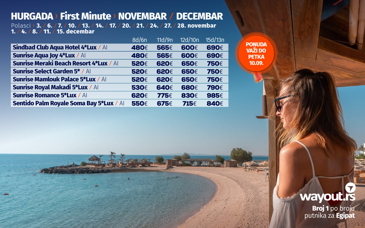 Један од показатеља да је Хургада једна од најсигурнијих туристичких дестинација, као и искуства путника који су прошле године, у време пандемије путовали у Египат, јесте то да су поједини хотели већ изашли са понудом за поласке у новембру и децембру, а ми смо за све наше путнике издвојили најтраженије хотеле по специјалним Ултра Фирст Минуте ценама, а обзиром да је тражња за путовањима у Хургаду огромна, саветујемо да на време резервишете своје место и без стреса сачекате своје јесење путовање у новембру или децембру са најповољнијим ценама.