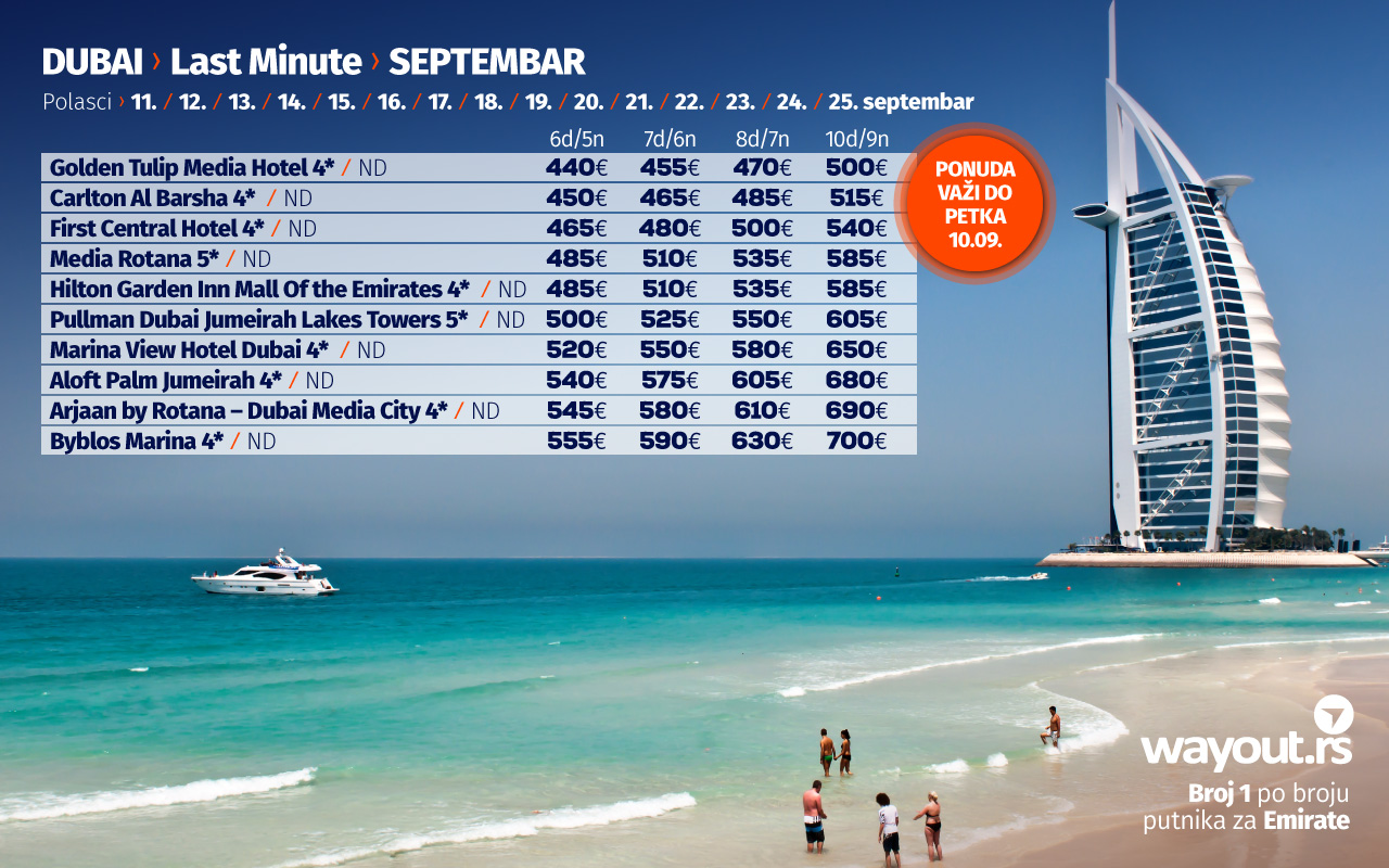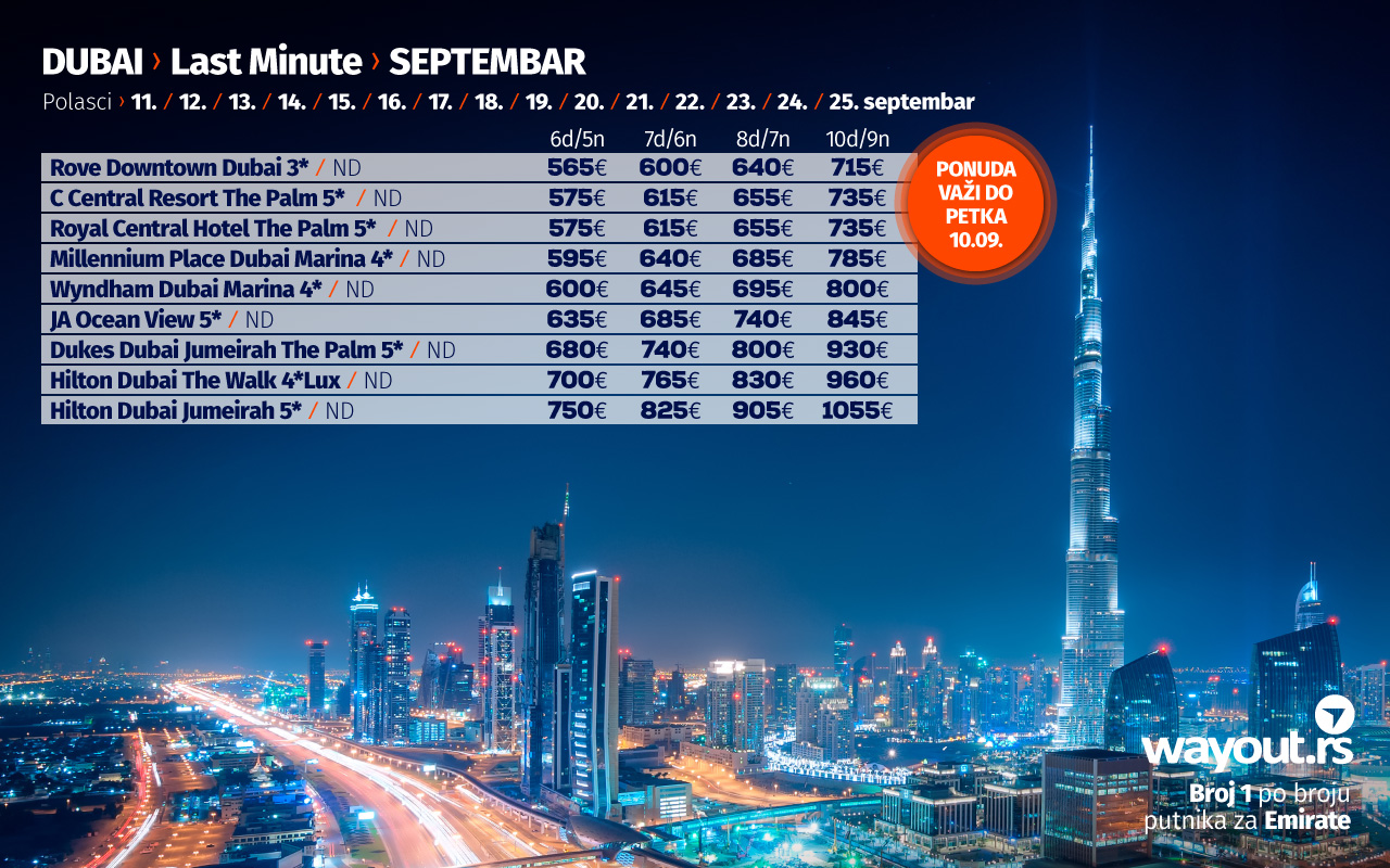 Као што сте навикли претходне јесени и зиме, уз неизбежан одмор на дивним плажама Арабијског залива, препоручујемо путовање у Дубаи у септембру и октобру. За наше путнике смо издвојили неке од најпопуларнијих хотела са најприступачнијим ценама, а Дубаи свакако важи за једну од најсигурнијих и најорганизованијих дестинација које су се међу првима опоравиле и наставиле нормално функционисање након пандемије, а ако сте навикли да своје путовање у Дубаи резервишете преко туристичких портала, проверите наше пакет аранжмане који укључују авио карте, трансфере на дестинацији, смештај у врхунским хотелима, као и услуге лиценцираног водича на српском језику и уверите се у то да су наше цене најповољније уз максимално квалитетну услугу.