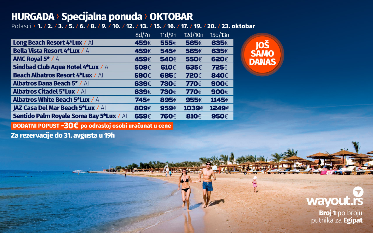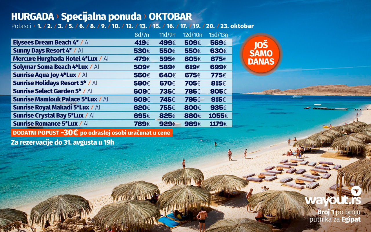 Уколико још увек нисте стигли да резервишете своје путовање, без много размишљања, дефинитвно, најсигурнији и најповољнији избор овог лета и јесени је Хургада и одмор на прелепим плажама Црвеног мора, а за све оне који би да што пре побегну од свакодневних обавеза, спремили смо неодољиве