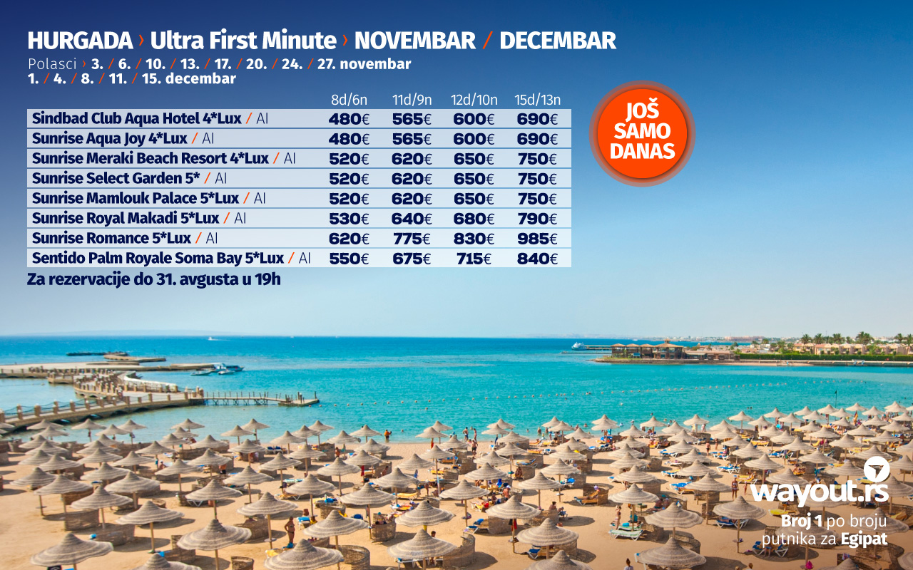Ultra First Minute понуду за поласке у новембру и децембру, са најповољнијим ценама аранжмана до сада и са највећим избором хотела на тржишту. Обзиром на то да ће Хургада и у наредним месецима бити једна од главних светских туристичких дестинација, свима препоручујемо да се што пре одлуче за жељени термин и жељени хотел, како би свој аранжман букирали пре путника из осталих европских земаља као што су Немачка, Румунија, Чешка, Пољска, Украјина, Русија...