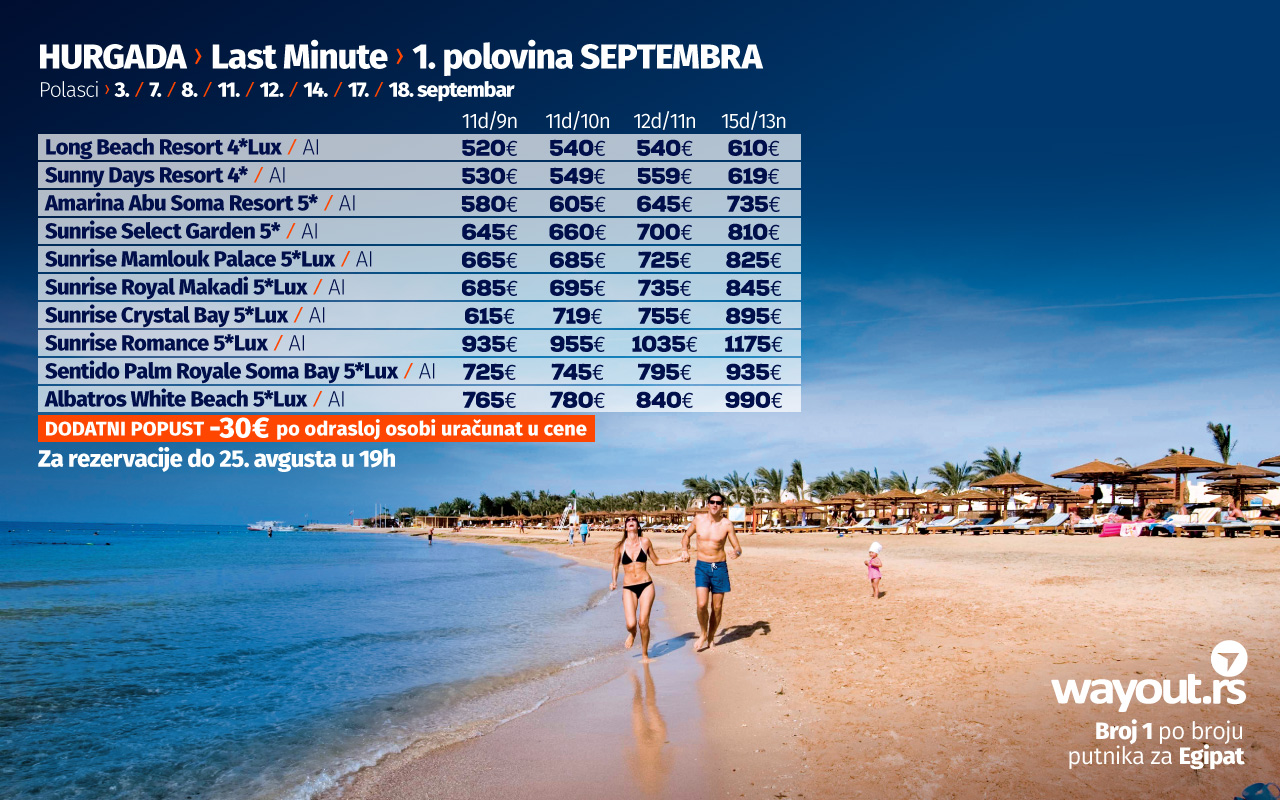 Уколико још увек нисте стигли да резервишете своје путовање, без много размишљања, дефинитвно, најсигурнији и најповољнији избор овог лета и јесени је Хургада и одмор на прелепим плажама Црвеног мора, а за све оне који би да што пре побегну од свакодневних обавеза, спремили смо неодољиве last minute понуде за прву половину септембра и то за поласке 03. / 07. / 08. / 11. / 12. / 14. / 17. / 19. септембар.