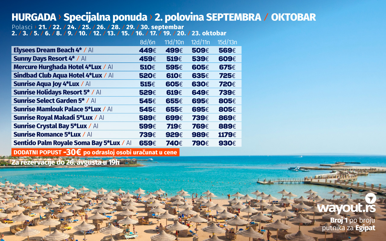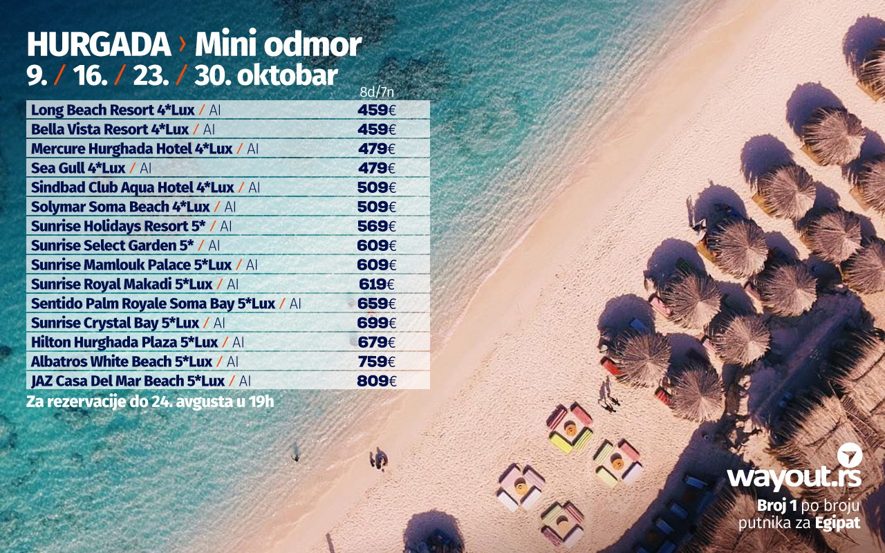Такође, посебно бисмо напоменули и новитет у Wayout понуди, а то су аранжмани за Мини одмор у Хургади, базирани на 8 дана / 7 ноћења у октобру, са поласцима 9. / 16. / 23. / 30. октобра у сарадњи са националном авио компанијом Аир Сербиа којој дугујемо велику захвалност на беспрекорној сарадњи, а пре свега су ови аранжмани намењени путницима који желе на кратко да оду из града или једноставно немају довољно слободних дана од годишњег одмора.