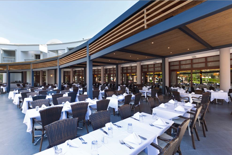 Услуга у хотелу је Алл Инцлусиве – доручак, ручак, вечера и касна вечера, по принципу самопослуживања, избор више јела према хотелским правилима. Главни оброци се послужују у главном ресторану, а поред њега, гостима је на располагању и један а ла царте ресторан, који је без доплате, уз претходну резервацију, могуће посетити једном у току боравка.
