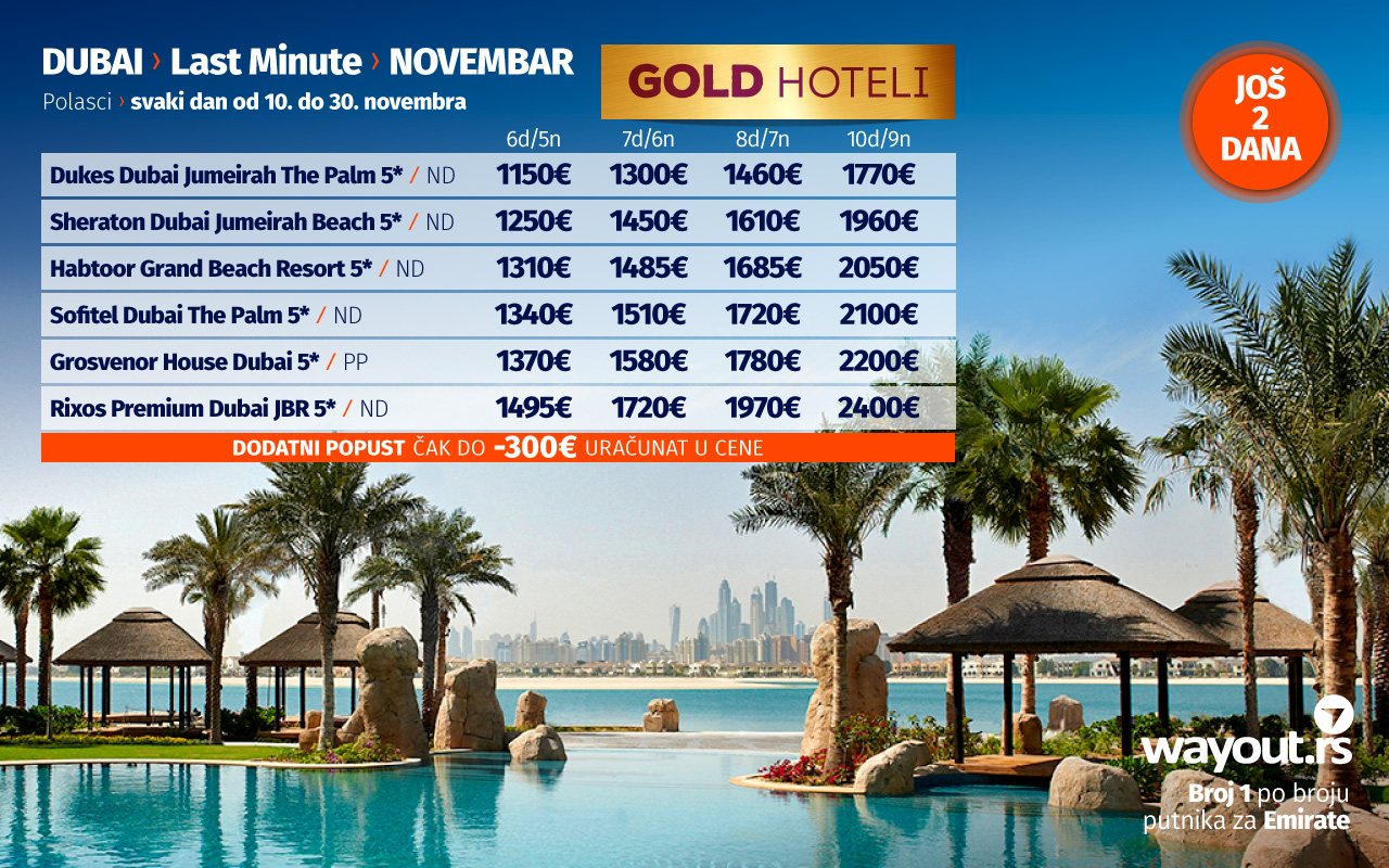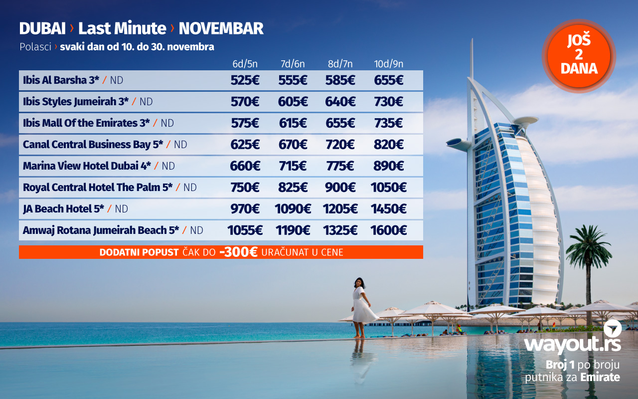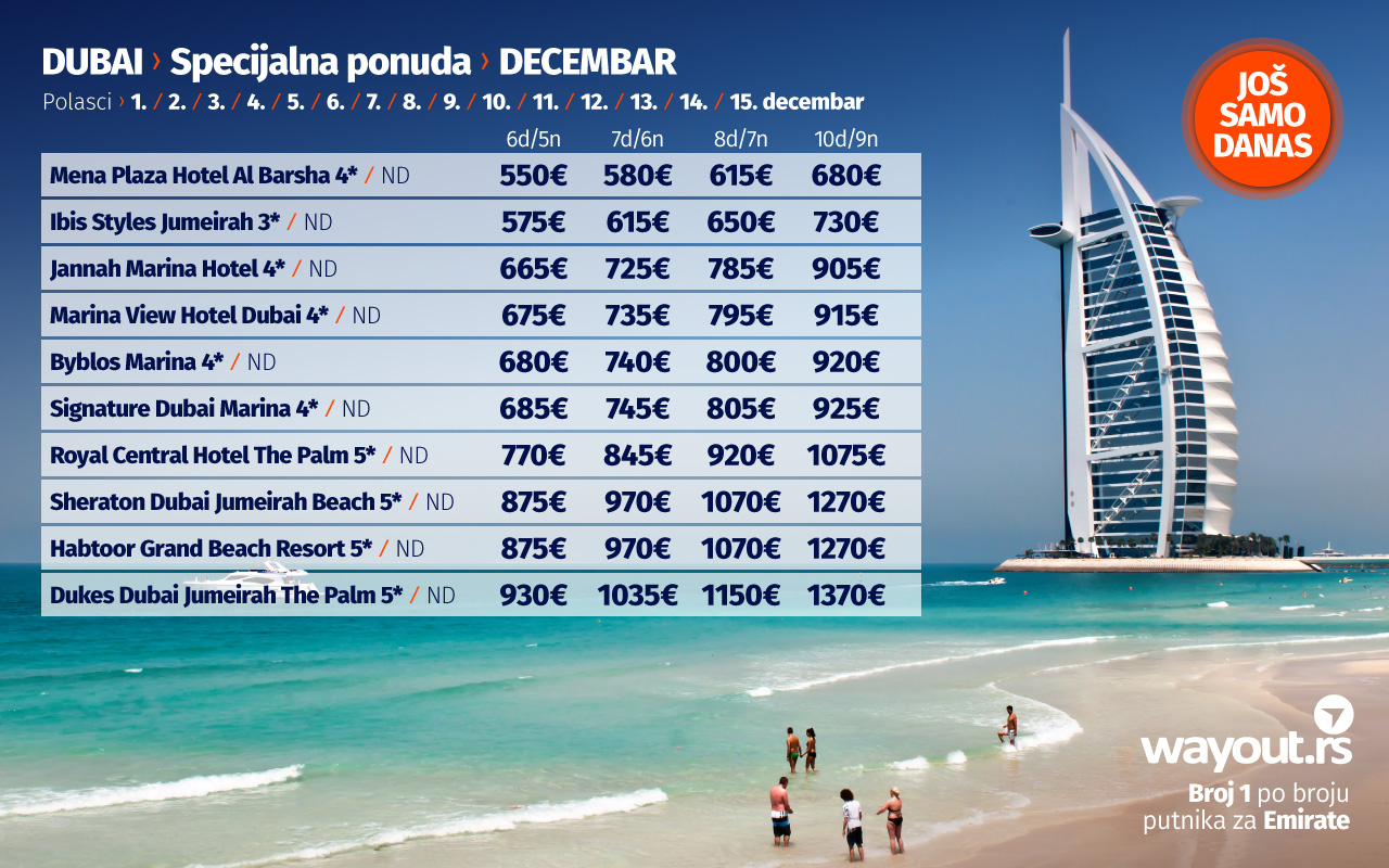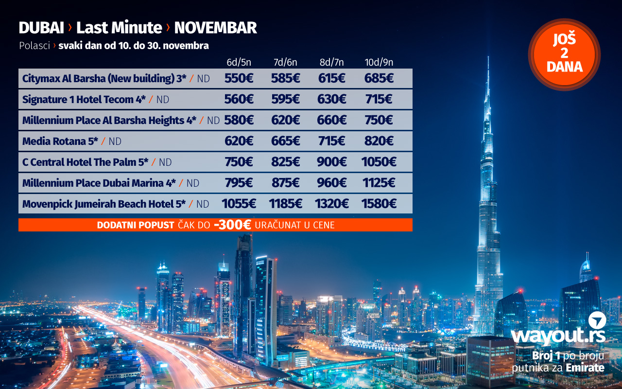 Wаyоут агенција, као туроператор бр. 1 по броју путника за Дубаи, увек се труди да својим путницима понуди само најбоље од најбољег, а у складу са тим, наша ласт минуте понуда за новембар, као и специјална понуда за поласке у децембру обилују сјајним понудама са најтраженијим хотелима, по најповољнијим ценама.