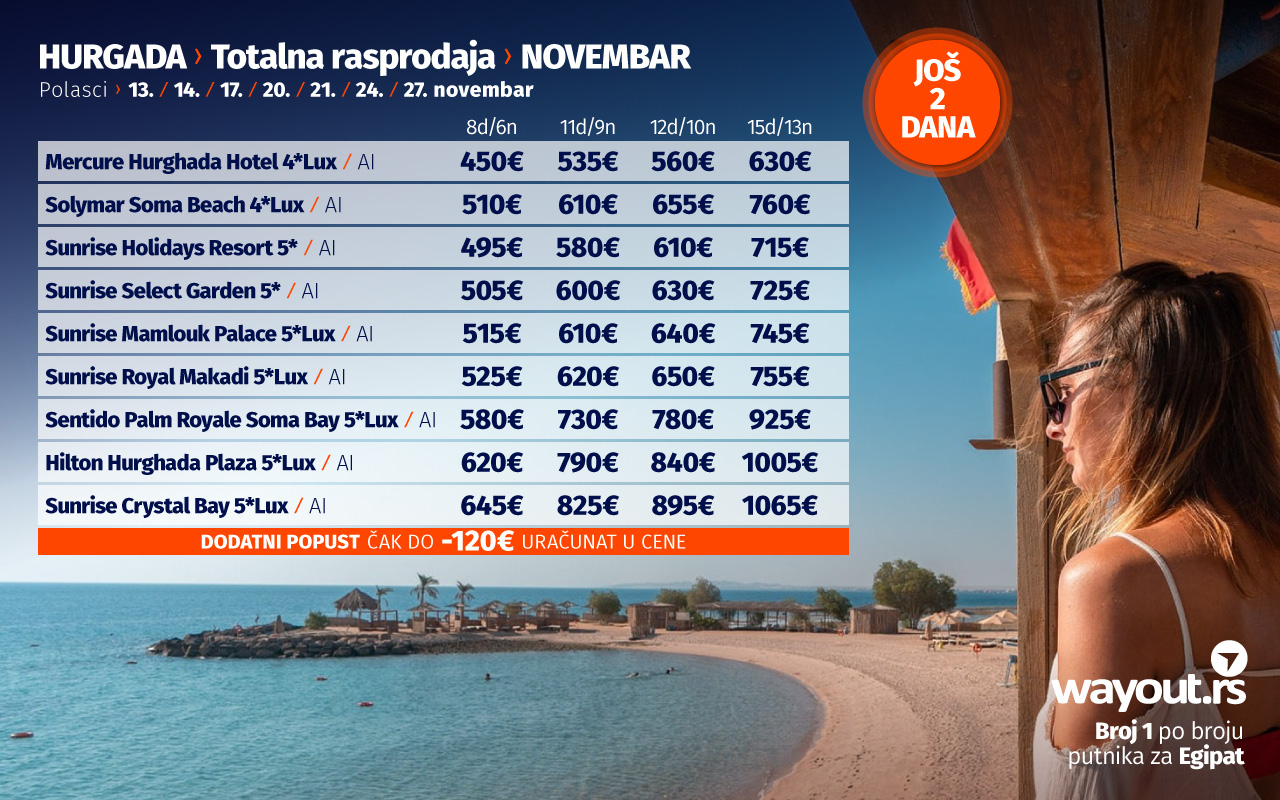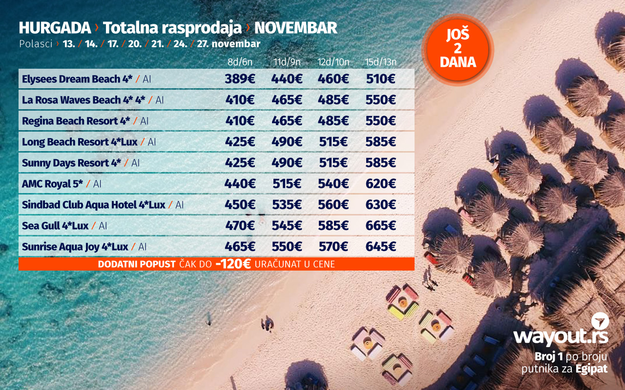 Пошто лето у Хургади траје током целе године, за све путнике смо спремили тоталну распродају аранжмана за најсигурније јесење путовање, а која обухвата Ласт минуте понуду за поласке у новембру, као и Фирст Минуте понуду за поласке у децембру, јануару и фебруару са најповољнијим ценама аранжмана до сада и са највећим избором хотела на тржишту. С обзиром на то да ће Хургада и у наредним месецима бити једна од главних светских туристичких дестинација, свима препоручујемо да се што пре одлуче за жељени термин и жељени хотел, како би свој аранжман букирали пре путника из осталих европских земаља као што су Немачка, Румунија, Чешка, Пољска, Украјина, Русија, а све то за само 199 евра по резервацији, док је остатак аранзмана потребно исплатити 15 дана пре путовања...