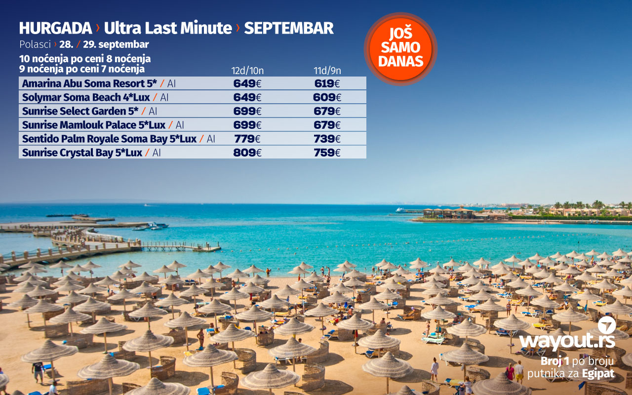 Такође, посебно бисмо напоменули и новитет у Wayout понуди, а то су аранжмани за Мини одмор у Хургади, базирани на 8 дана / 7 ноћења у октобру, са поласцима 9. / 16. / 23. / 30. октобра у сарадњи са