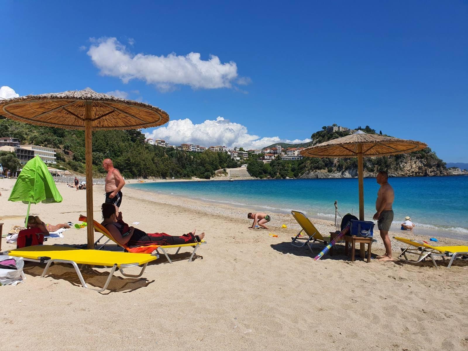 Плажа Валтос савршено чиста, лежаљке и сунцобрани удаљени.