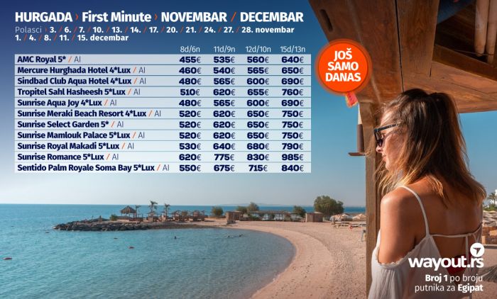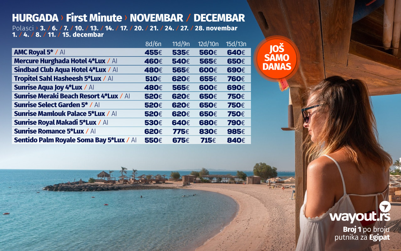 Један од показатеља да је Хургада једна од најсигурнијих туристичких дестинација, као и искуства путника који су прошле године, у време пандемије путовали у Египат, јесте то да су поједини хотели већ изашли са понудом за поласке у новембру и децембру, а ми смо за све наше путнике издвојили најтраженије хотеле по специјалним Ultra First Minute ценама, а обзиром да је тражња за путовањима у Хургаду огромна, саветујемо да на време резервишете своје место и без стреса сачекате своје јесење путовање у новембру или децембру са најповољнијим ценама.