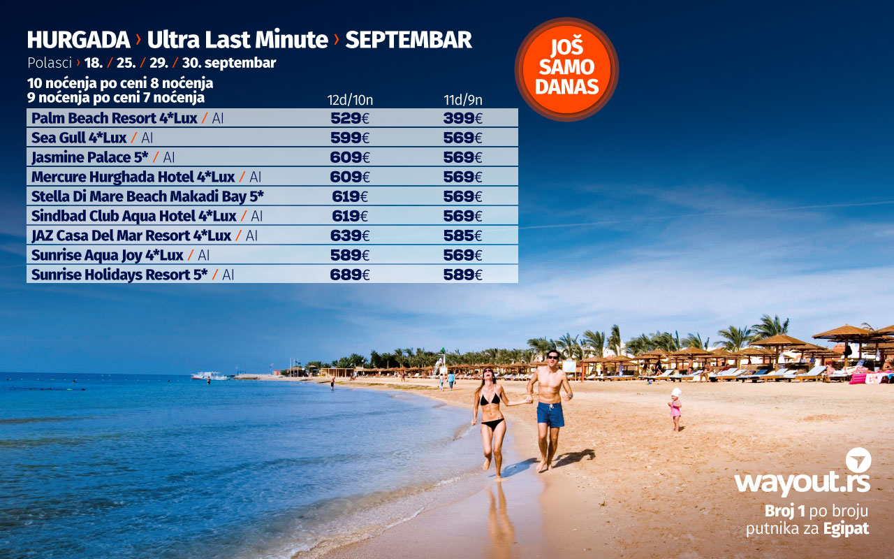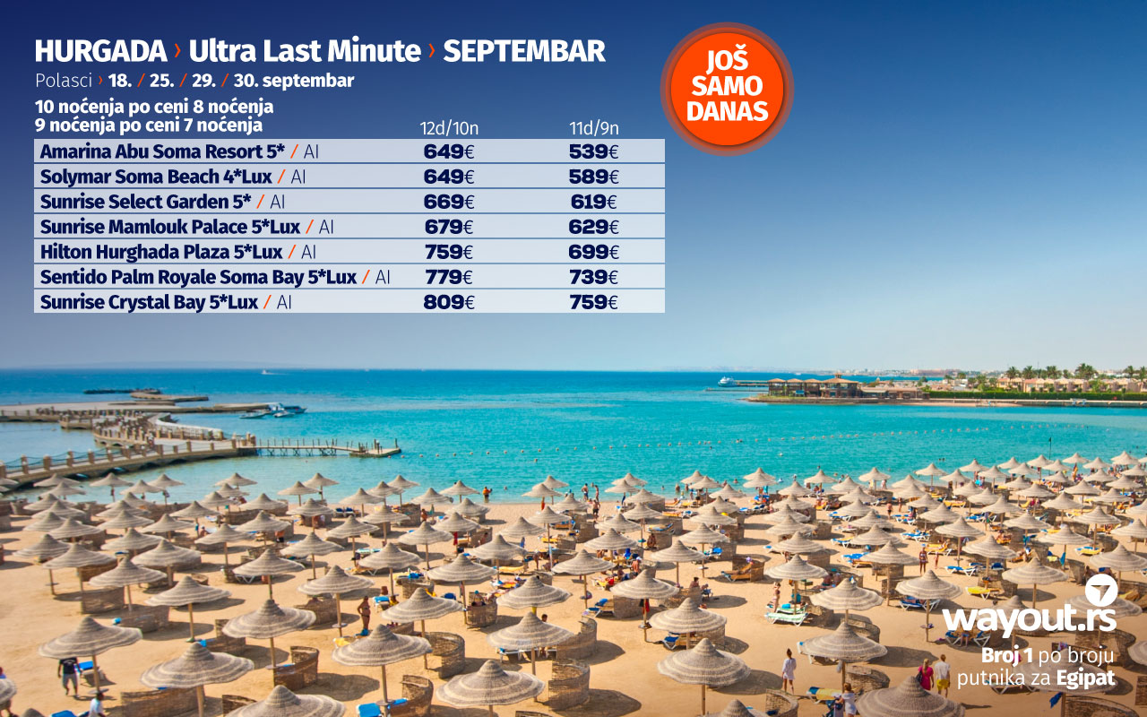 Уколико још увек нисте стигли да резервишете своје путовање, без много размишљања, дефинитвно, најсигурнији и најповољнији избор ове јесени је Хургада и одмор на прелепим плажама Црвеног мора, а за све оне који би да што пре побегну од свакодневних обавеза, спремили смо неодољиву понуду у виду ТОТАЛНЕ ЛЕТЊЕ РАСПРОДАЈЕ за период путовања у септембру и октобру, са посебним акцентом на ULTRA LAST MINUTE понуду за поласке 18. / 25. / 29. / 30. септембра.