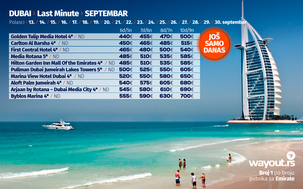 Као што сте навикли претходне јесени и зиме, уз неизбежан одмор на дивним плажама Арабијског залива, препоручујемо путовање у Дубаи у септембру и октобру. За наше путнике смо издвојили неке од најпопуларнијих хотела са најприступачнијим ценама, а Дубаи свакако важи за једну од најсигурнијих и најорганизованијих дестинација које су се међу првима опоравиле и наставиле нормално функционисање након пандемије, а ако сте навикли да своје путовање у Дубаи резервишете преко туристичких портала, проверите наше пакет аранжмане који укључују авио карте, трансфере на дестинацији, смештај у врхунским хотелима, као и услуге лиценцираног водича на српском језику и уверите се у то да су наше цене најповољније уз максимално квалитетну услугу.