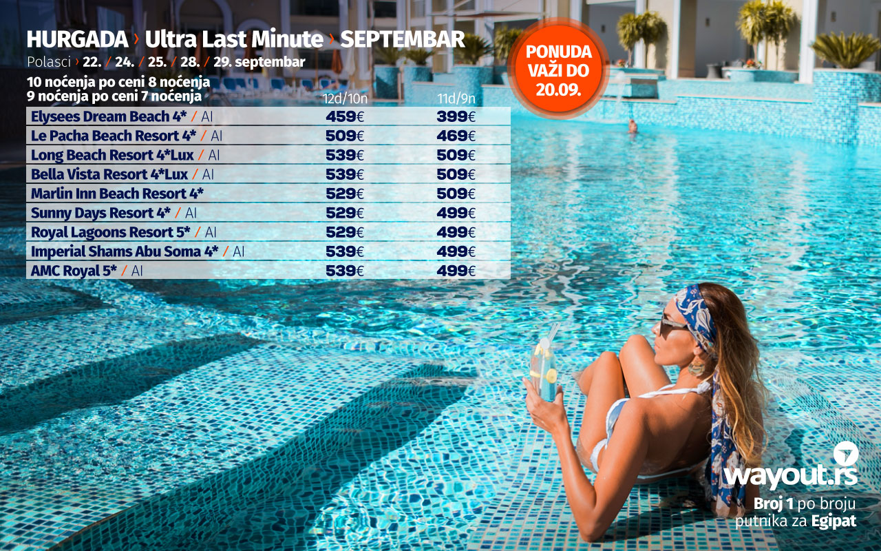 Уколико још увек нисте стигли да резервишете своје путовање, без много размишљања, дефинитвно, најсигурнији и најповољнији избор ове јесени је Хургада и одмор на прелепим плажама Црвеног мора, а за све оне који би да што пре побегну од свакодневних обавеза, спремили смо неодољиву понуду у виду ТОТАЛНЕ ЛЕТЊЕ РАСПРОДАЈЕ за период путовања у септембру и октобру, са посебним акцентом на УЛТРА ЛАСТ МИНУТЕ понуду за поласке 22. / 24. / 25. / 28. / 29. септембра.