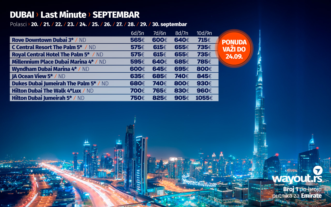 најпопуларнијих хотела са најприступачнијим ценама, а Дубаи свакако важи за једну од најсигурнијих и најорганизованијих дестинација које су се међу првима опоравиле и наставиле нормално функционисање након пандемије, а ако сте навикли да своје путовање у Дубаи резервишете преко туристичких портала, проверите наше пакет аранжмане који укључују авио карте, трансфере на дестинацији, смештај у врхунским хотелима, као и услуге лиценцираног водича на српском језику и уверите се у то да су наше цене најповољније уз максимално квалитетну услугу.