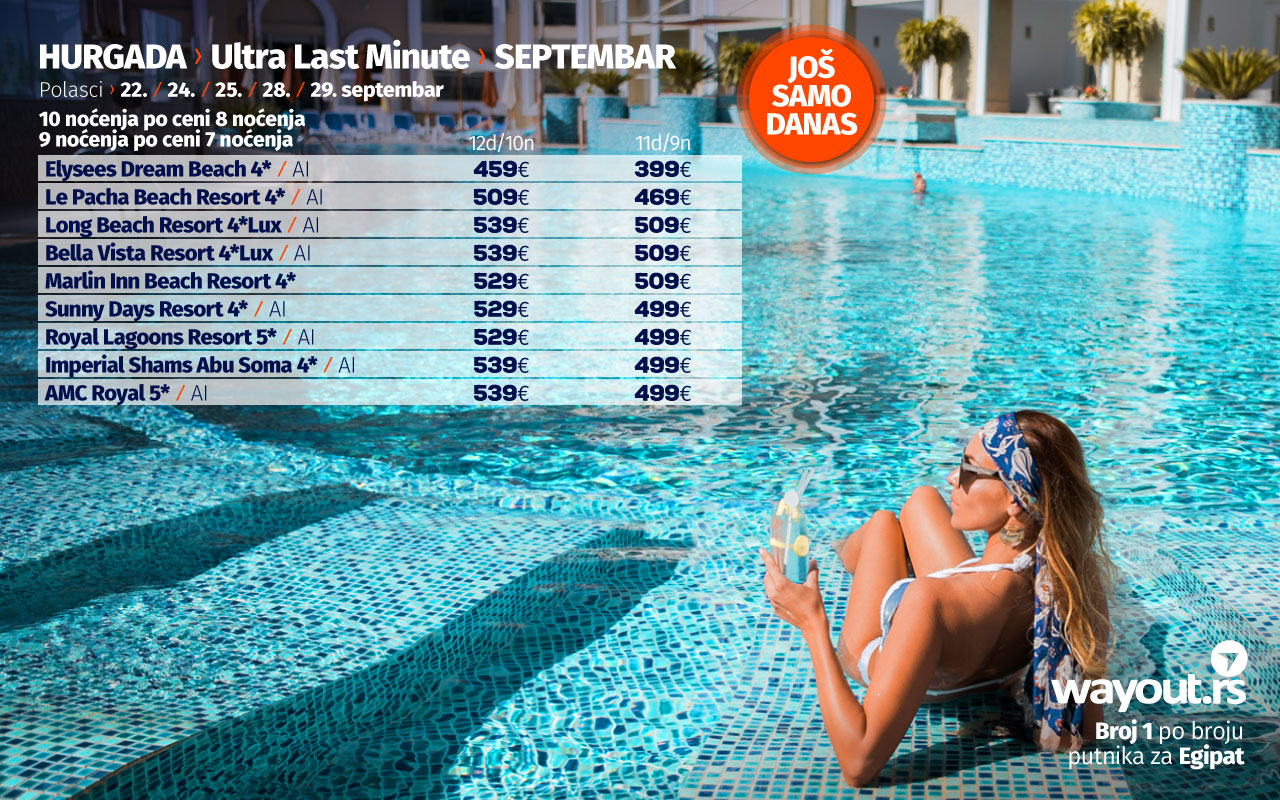 Пошто лето у Хургади траје током целе године, за све путнике смо спремили врелу летњу распродају за најсигурније јесење путовање, а која обухвата тоталну распродају за поласке у септембру и октобру, као и Ultra First Minute понуду за поласке у новембру и децембру, са најповољнијим ценама аранжмана до сада и са највећим избором хотела на тржишту. Обзиром на то да ће Хургада и у наредним месецима бити једна од главних светских туристичких дестинација, свима препоручујемо да се што пре одлуче за жељени термин и жељени хотел, како би свој аранжман букирали пре путника из осталих европских земаља као што су Немачка, Румунија, Чешка, Пољска, Украјина, Русија, а све то за само 199еур по резервацији, док је остатак аранзмана потребно исплатити 15 дана пре путовања...