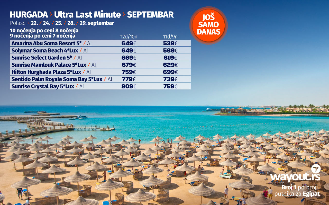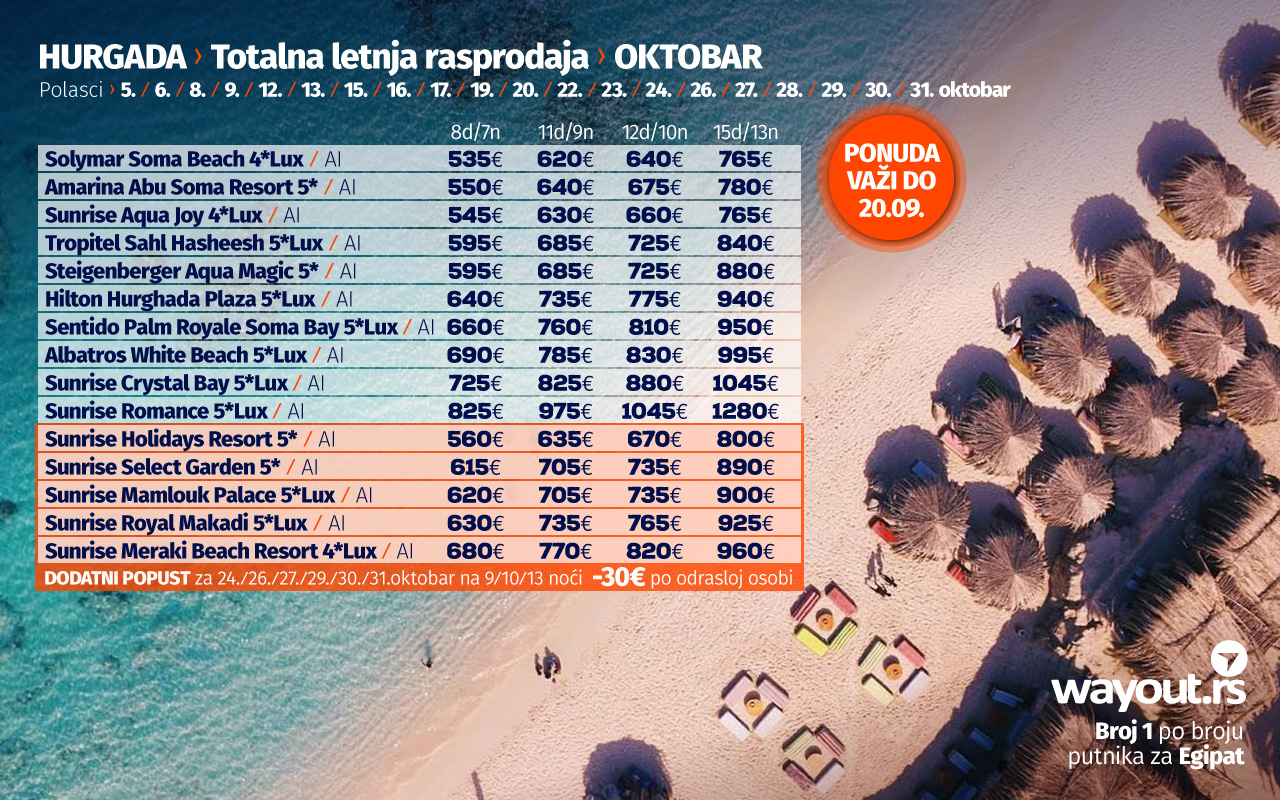 Уколико још увек нисте стигли да резервишете своје путовање, без много размишљања, дефинитвно, најсигурнији и најповољнији избор ове јесени је Хургада и одмор на прелепим плажама Црвеног мора, а за све оне који би да што пре побегну од свакодневних обавеза, спремили смо неодољиву понуду у виду ТОТАЛНЕ ЛЕТЊЕ РАСПРОДАЈЕ за период путовања у септембру и октобру, са посебним акцентом на