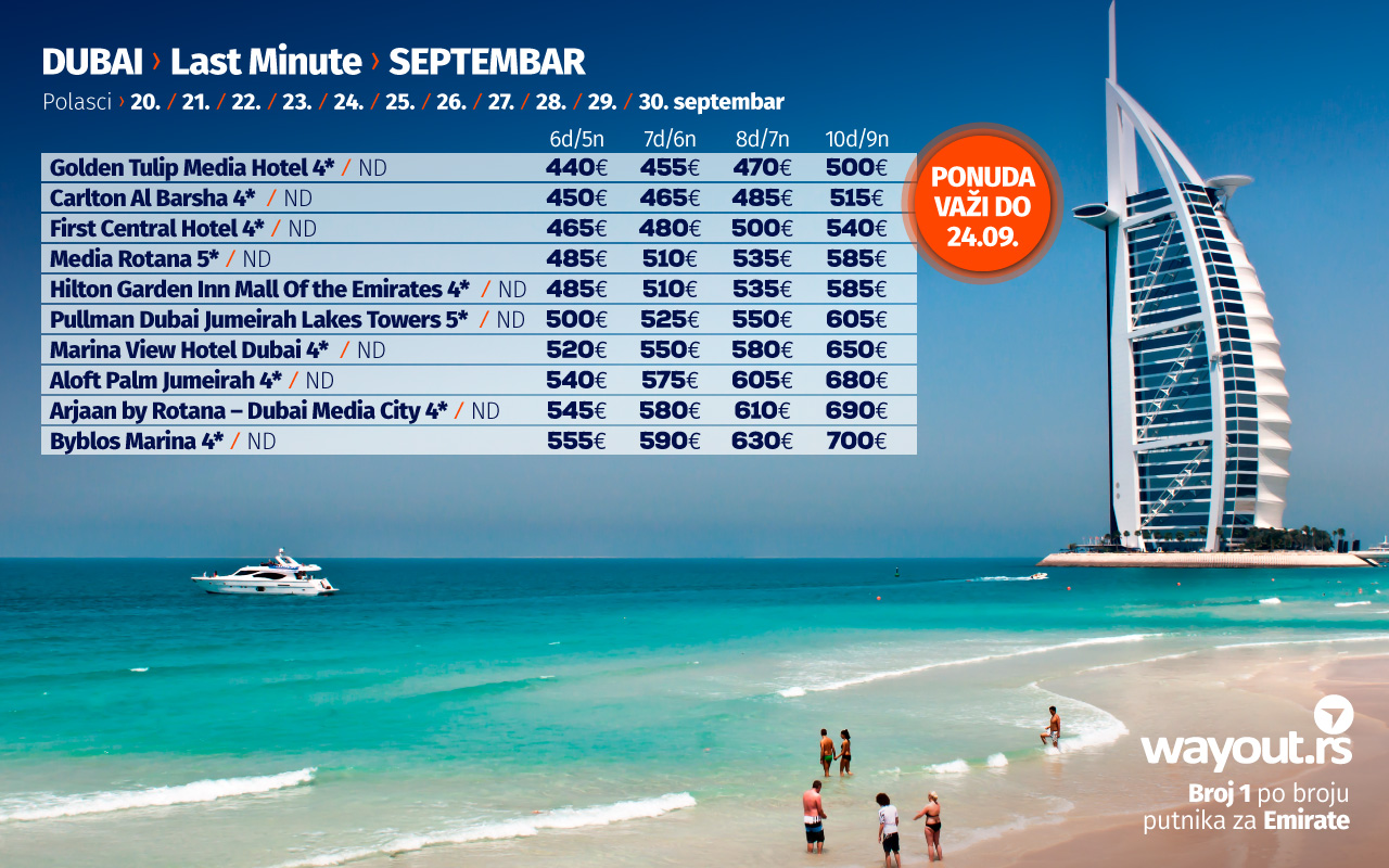 најпопуларнијих хотела са најприступачнијим ценама, а Дубаи свакако важи за једну од најсигурнијих и најорганизованијих дестинација које су се међу првима опоравиле и наставиле нормално функционисање након пандемије, а ако сте навикли да своје путовање у Дубаи резервишете преко туристичких портала, проверите наше пакет аранжмане који укључују авио карте, трансфере на дестинацији, смештај у врхунским хотелима, као и услуге лиценцираног водича на српском језику и уверите се у то да су наше цене најповољније уз максимално квалитетну услугу.