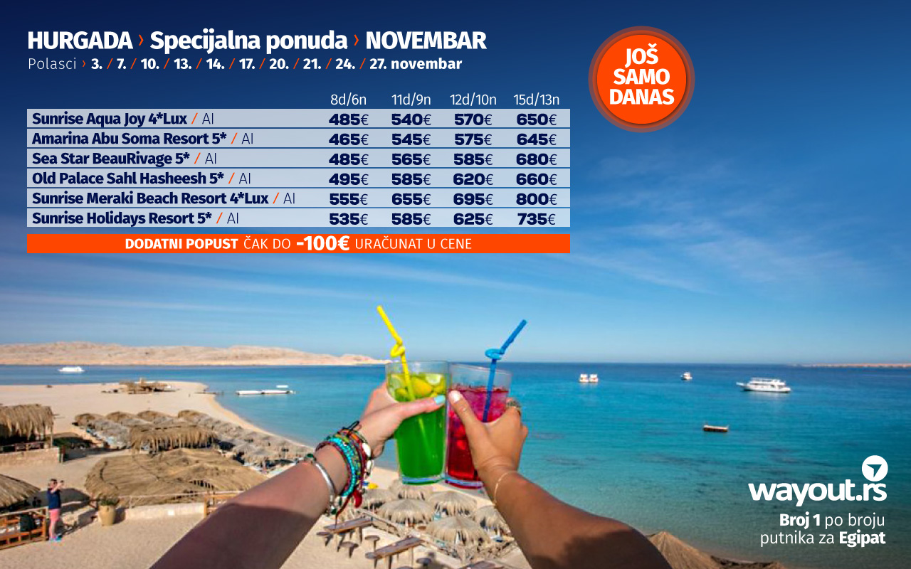 Уколико још увек нисте стигли да резервишете своје путовање, без много размишљања, дефинитвно, најсигурнији и најповољнији избор ове јесени је Хургада и одмор на прелепим плажама Црвеног мора, а за све оне који би да што пре побегну од свакодневних обавеза, спремили смо неодољиву ЛАСТ МИНУТЕ понуду која се односи на последња места, како у авионима, тако и у хотелима за поласке у октобру и новембру, као и СПЕЦИЈАЛНУ ПОНУДУ за поласке у другој половини новембра.