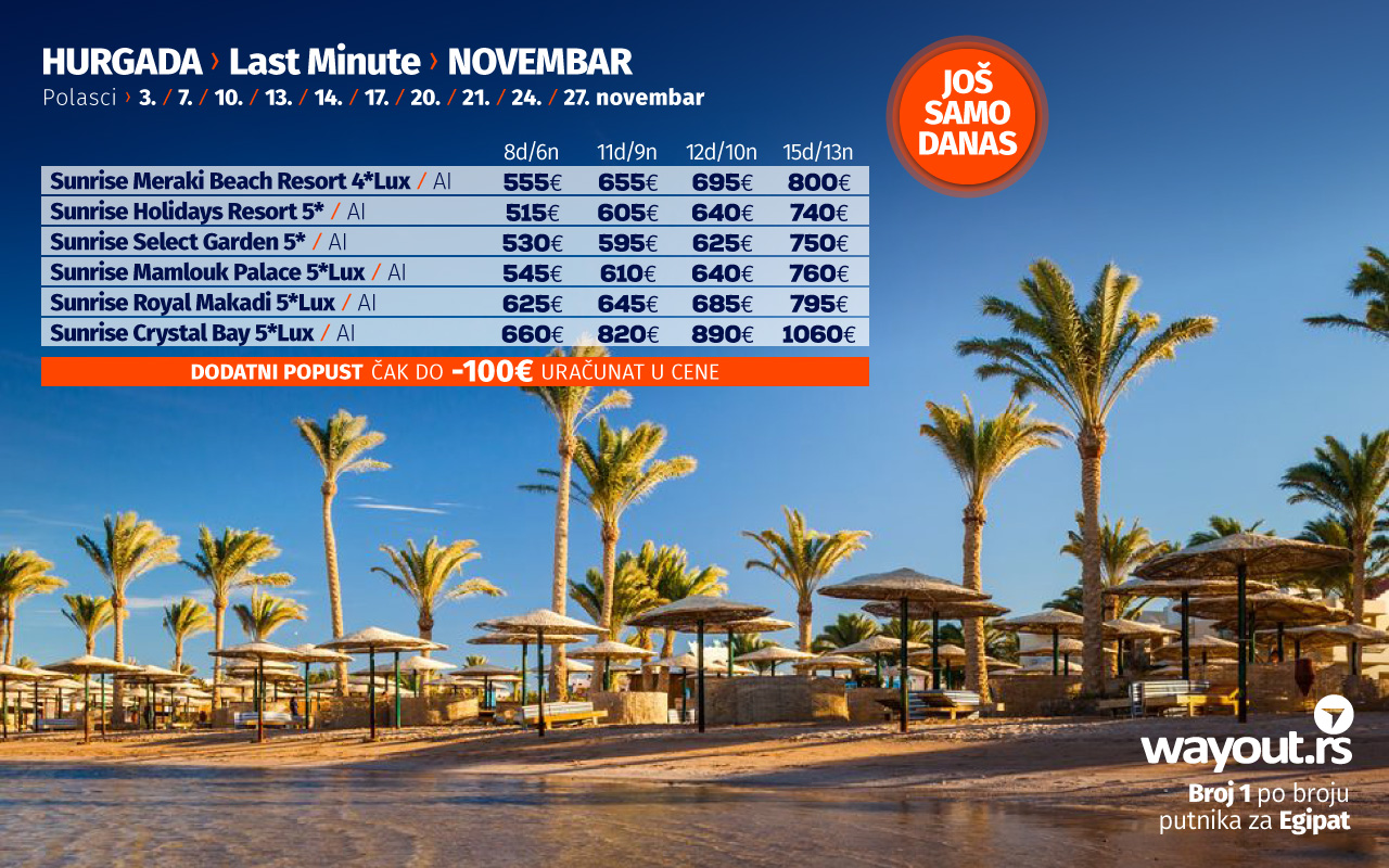 ЛАСТ МИНУТЕ понуда за Хургаду је састављена од најтраженијих хотела са невероватно повољним ценама, најповољнијим до сада и препоручујемо путницима да искористе ову неодољиву понуду и отпутују на своје дуго чекано путовање и побегну од јесењих дана на увек сунчану дестинацију каква је Хургада, где ће их дочекати надалеко позната египатска гостољубивост и веома квалитетни хотели.
