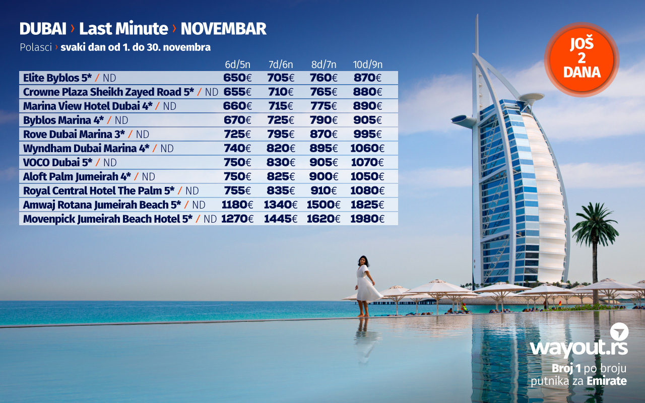 Као што сте навикли претходне јесени и зиме, уз неизбежан одмор на дивним плажама Арабијског залива, препоручујемо путовање у Дубаи у новембру и децембру по никад повољнијим ценама. За наше путнике смо издвојили неке од најпопуларнијих хотела са најприступачнијим ценама, а Дубаи свакако важи за једну од најсигурнијих и најорганизованијих дестинација које су се међу првима опоравиле и наставиле нормално функционисање након пандемије, а ако сте навикли да своје путовање у Дубаи резервишете преко туристичких портала, проверите наше пакет аранжмане који укључују авио карте, трансфере на дестинацији, смештај у врхунским хотелима, као и услуге лиценцираног водича на српском језику и уверите се у то да су наше цене најповољније уз максимално квалитетну услугу.