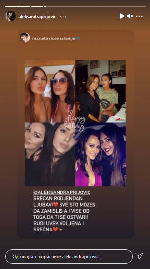 Популарна певачица Александра Пријовић, која поносно носи титулу Бренине снајке, данас прославља свој 26. рођендан. Тим поводом огласиле су се бројне познате личности и колеге, а прве честитке стигле су од атрактивне певачице Анастасије Ражнатовић.