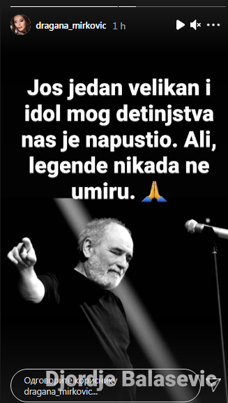 - Још један великан и идол мог детињства нас је напустио. Али, легенде никада не умиру - написала је на свом Инстаграм профилу, на сторију велика балканска звезда Драгана Мирковић.