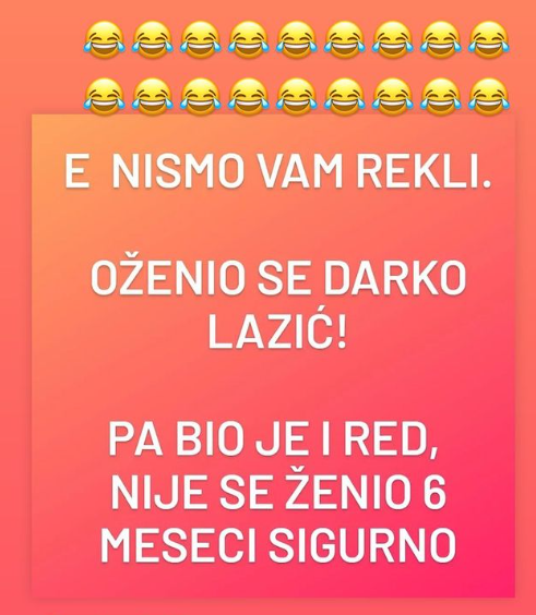 - Е, нисмо вам рекли. Оженио се Дарко Лазић! Па био је и ред, није се женио шест месеци сигурно - пише на фотографији коју је певач прокоментарисао емотиконима који плачу од смеха.