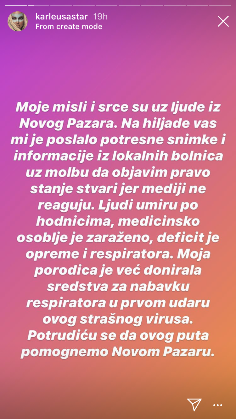 Осим тога, Јелена Карлеуша показала је саосећање и са грађанима Новог Пазара и околине, који су једно од највећих жаришта корона вируса у Србији тренутно. Она и њена породица тим поводом донирали су и новчана средства за набавку репсиратора у првом удару овог вируса и најавила да ће дати све од себе да донира и нова средства уа Нови Пазар.