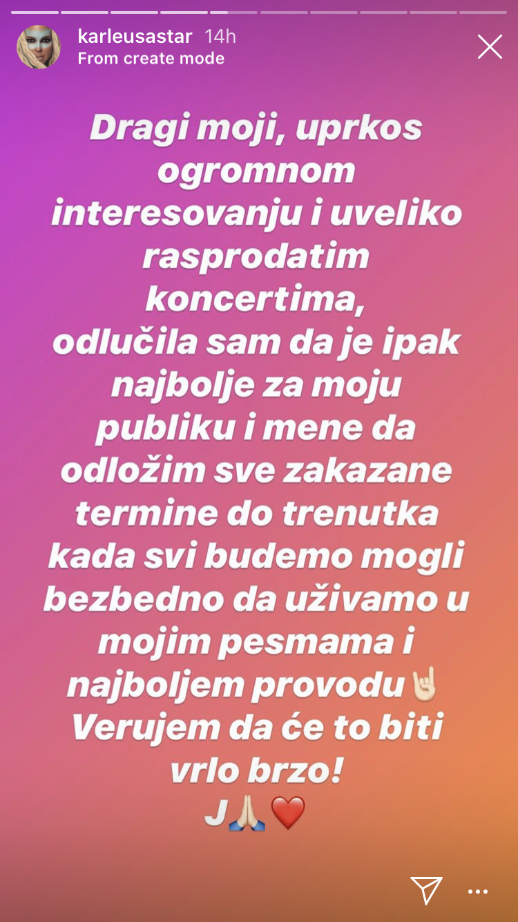 - Драги моји, упркос огромном интересовању и увелико распродатим концертима, одлучила сам да је ипак најбоље за моју публику и мене да одложим све заказане термине до тренутка када сви будемо могли безбедно да уживамо у мојим песмама и најбољем проводу. Верујем да ће то бити врло брзо - навела је Дива на свом званичном Instagram налогу.