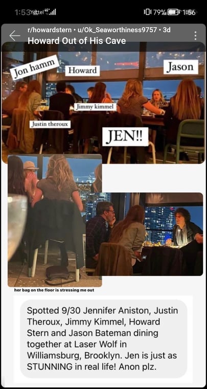 Икона серије ''Пријатељи'' Анистон (53), усликана је од стране знатижељног фана, у друштву бившег мужа и групе пријатеља у Њу Јорку, четири године након њиховог разлаза. Неке од познатих пријатеља који су се нашли у њиховом друштву укључују и: Џими Кимела, Џејсона Бејтмена и Хауарда Стерна са супругом.