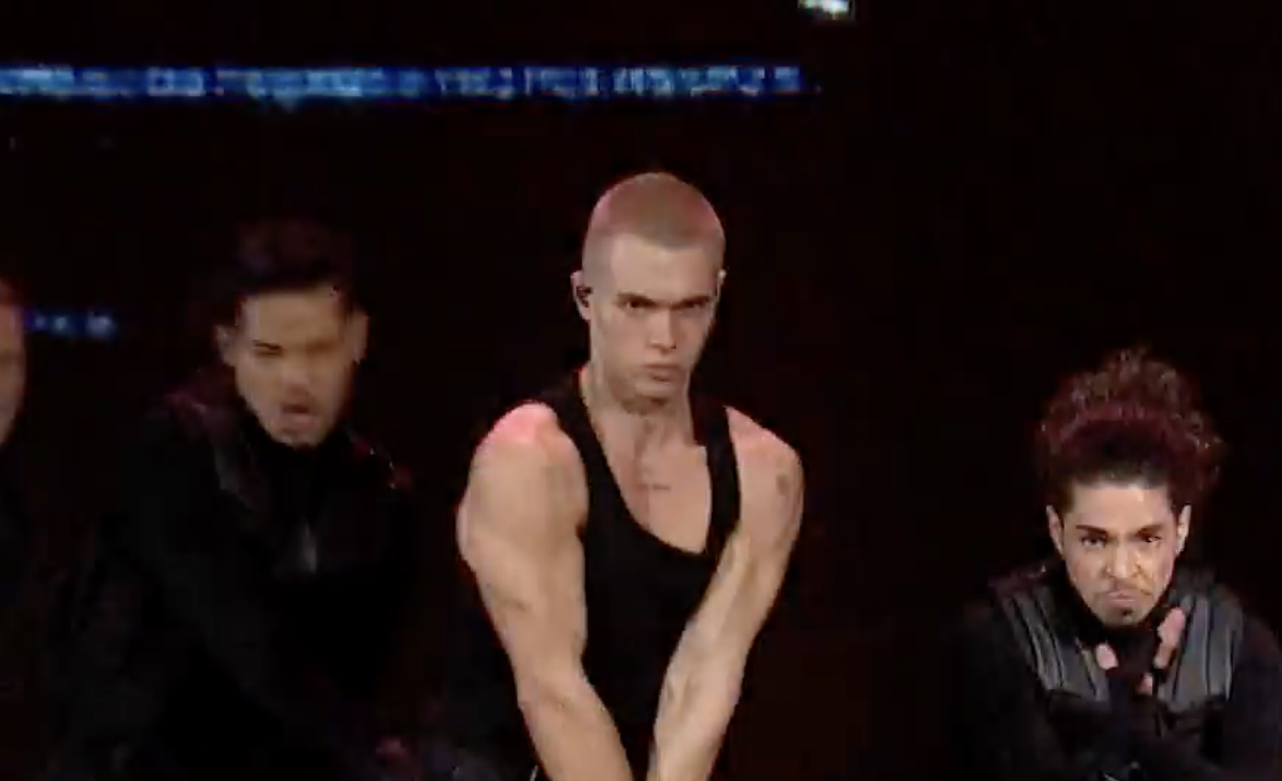 Филари је извео песму "Меет анд греет", обучен у црну мајицу на бретеле и панталоне.