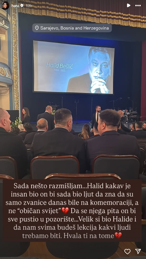 - Сада нешто размишљам - Халид какав је инсан био, он би сада био љут да зна да су само званице данас биле на комеморацији, а не "обичан свет". Да се он питао, он би све пустио у позориште... Велики си био, Халиде и да нам свима будеш лекција какви људи требамо бити. Хвала ти на томе - поручила је она на Инстаграму.