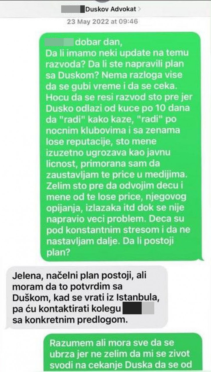 - Добар дан, Да ли имамо неких нових информација на тему развода? Да ли сте направили план са Душком? Нема разлога више да се губи време и да се чека. Хоћу да се реши развод што пре јер Душко одлази од куће по 10 дана да "ради" како каже, "ради" по ноћним клубовима и са женама лоше репутације, што мене изузетно угрожава као јавну личност, приморана сам да заустављам те приче у медијима. Желим што пре да одвојим децу и мене од те лоше приче, његовог опијања, излазака итд. Док се није направио већи проблем. Деца су под константним стресом и да не настављам даље. Да ли постоји план? - написала је ЈК, како пише, Душковом адвокату, на шта јој је он одговорио: