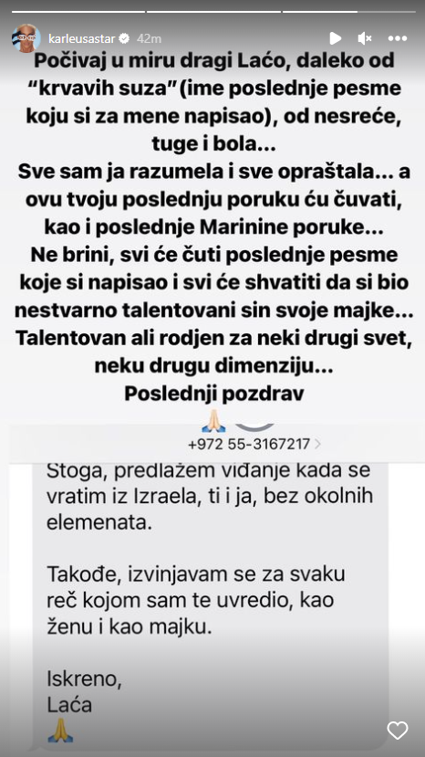 "Не брини, сви ће чути последње песме коије си написао и сви ће схватити да си био нестварно талентован син своје мајке ... талентован, али рођен за неки други свет, неку другу димензију", написала је Јелена Карлеуша и објавила Лаћину поруку којом јој се извинио.