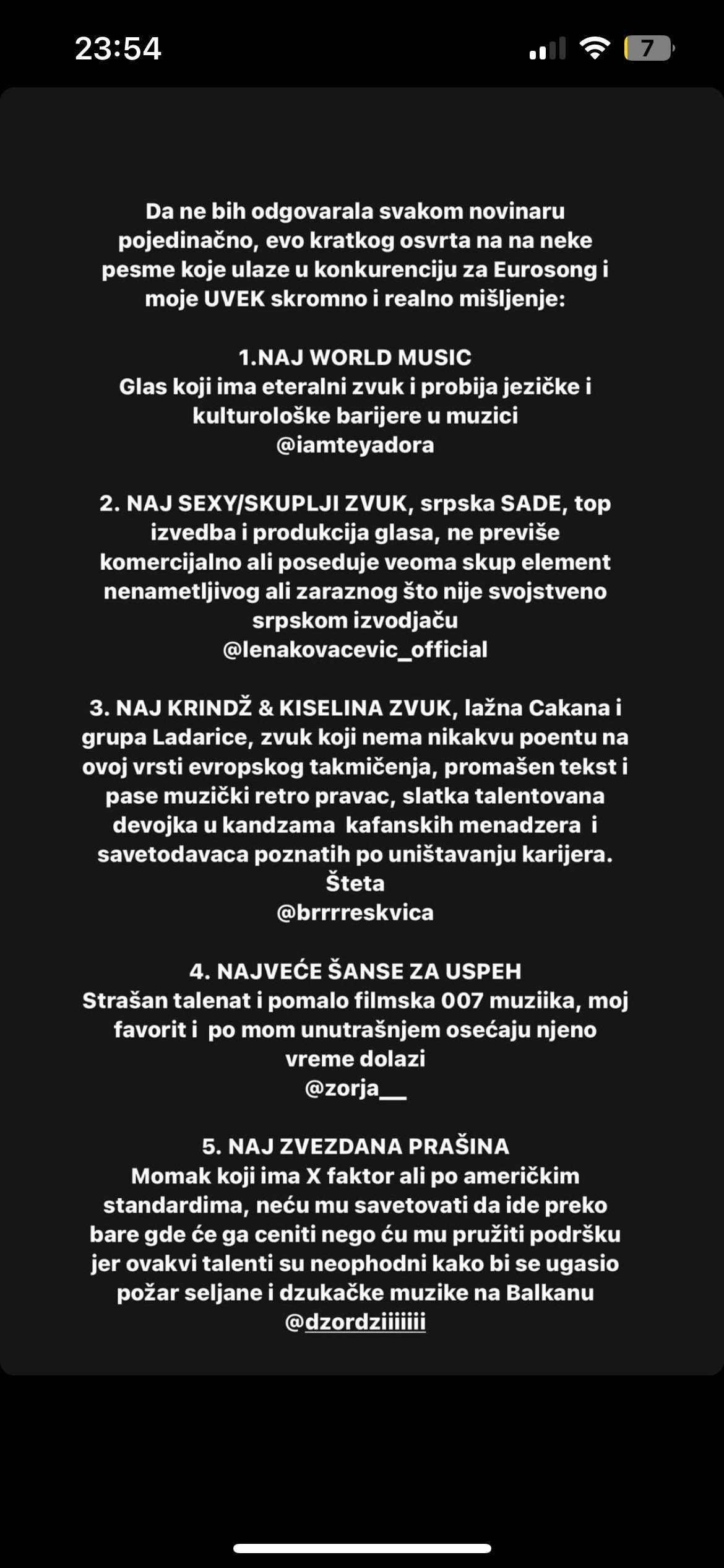 На свом сторију Јелена Карлеуша сурово је прокоментарисала такмичаре за "Песму за Евровизију".