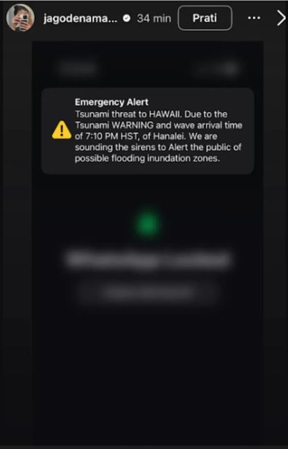 На Инстаграму је поделила да је путем мобилног телефона добила упозорење о могућности цунамија, као и најаву да ће се огласити сирене које упозоравају становнике у ризичним областима.