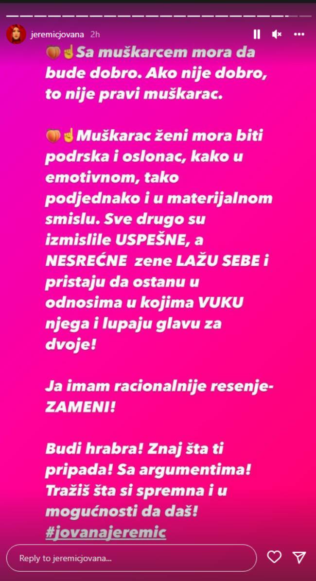 Овога пута, Јована је дала рационалан савет свим женама, како прави мушкарац треба да се понаша према њима и да уколико јој не посвећује довољно пажње и не бори се заједно са њом, треба да га замени.