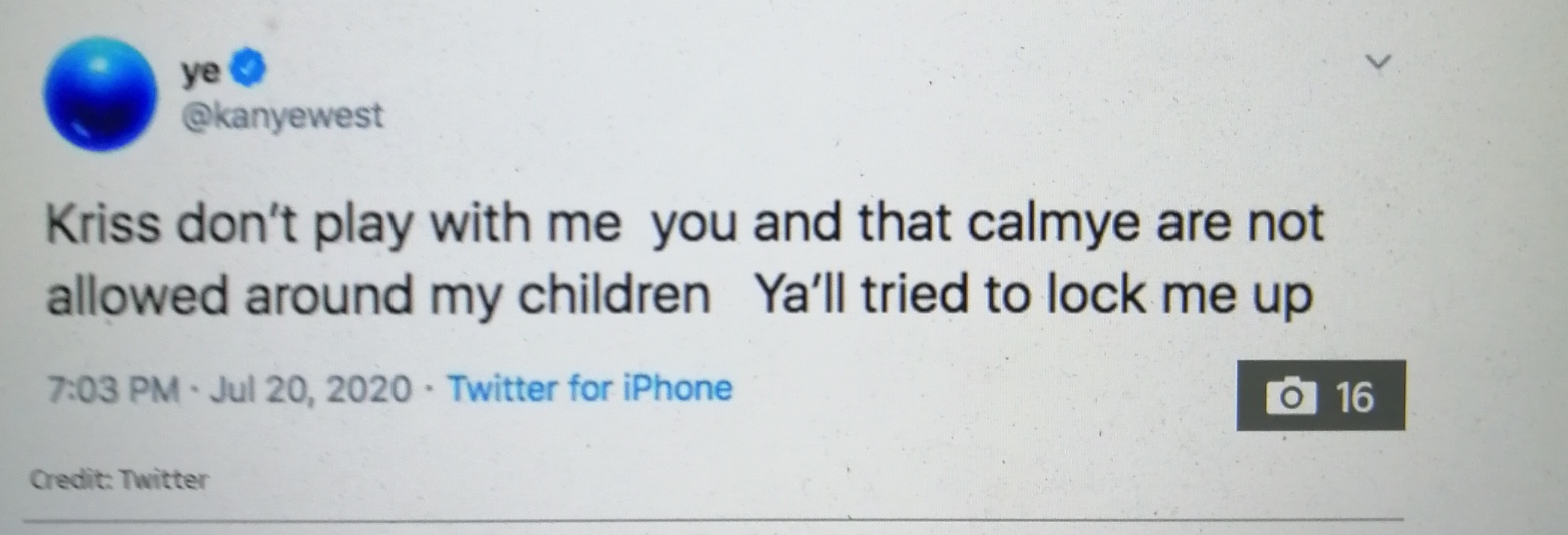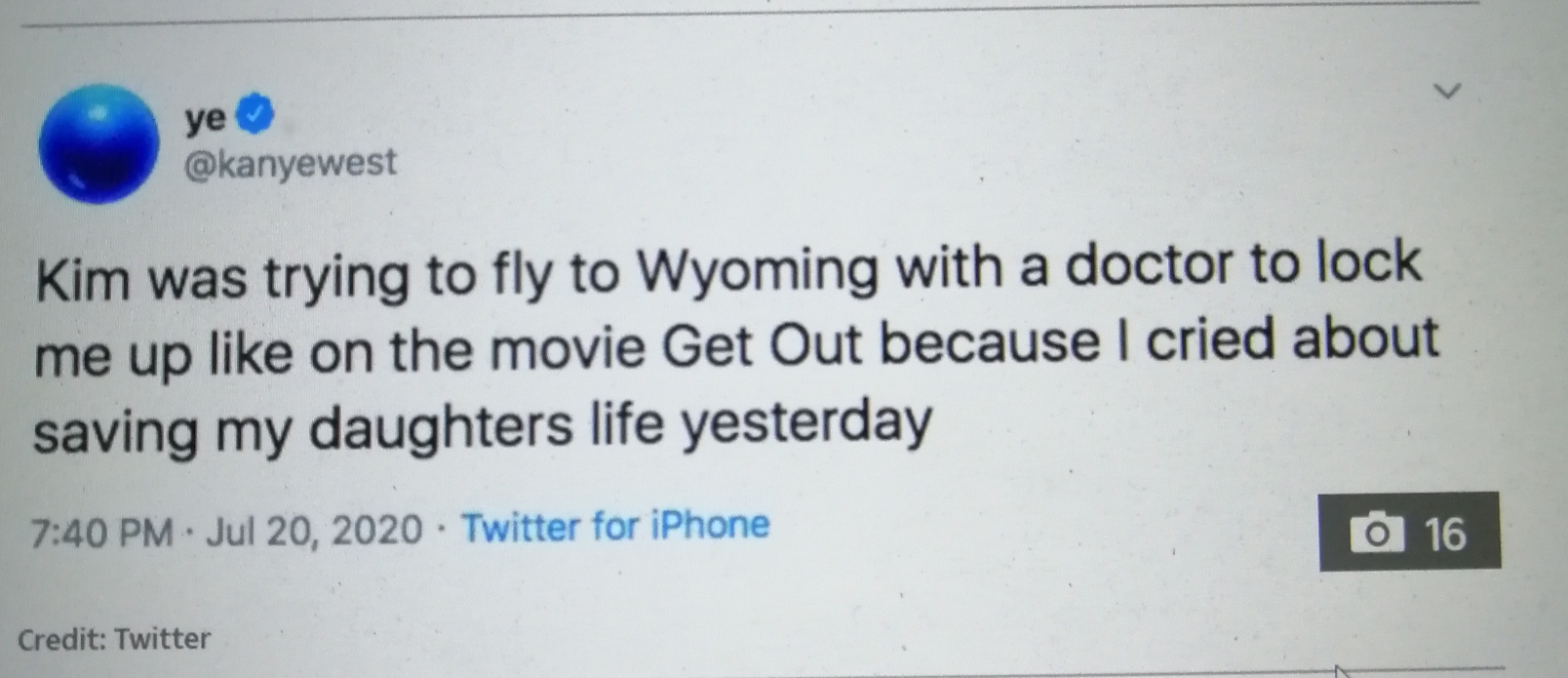 - Ким је хтела да доведе лекара, планирали су да ме закључају, само зато јер сам на митингу плакао због спашавања живота сопствене ћерке. Заборавите, моју децу никад нећете видети у Плејбоју, нема шансе!. Ако будем затворен попут Манделе, знаћете зашто... - писао је Кање на Твитеру, а онда се обратио својој ташти: