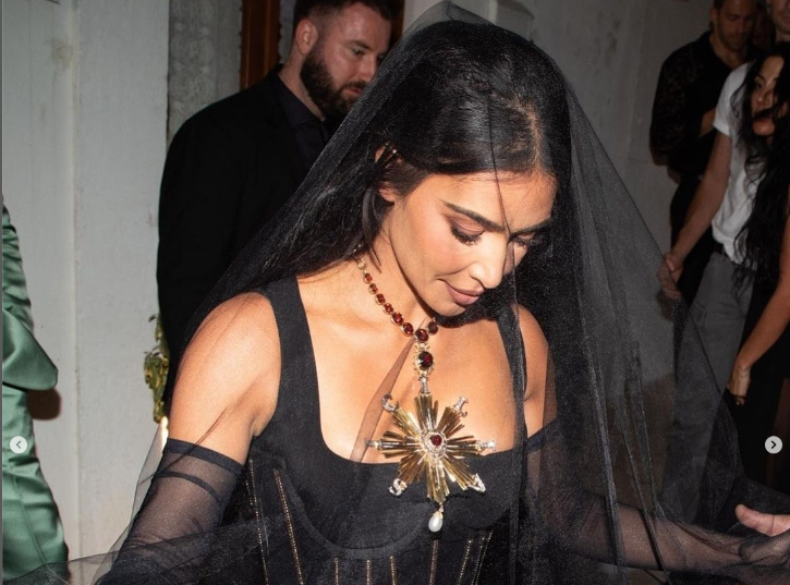Модни двојац обукао је стралету у неколико издања, а након раскошне бордо хаљине, Ким се појавила у црном од главе до пете, па је чак у једном тренутку носила и вео преко лица. Једини златни детаљи који су разбили овај монохроматски изглед биле су златне траке на корсету и предимензионирани крст који јој је лежао преко груди.