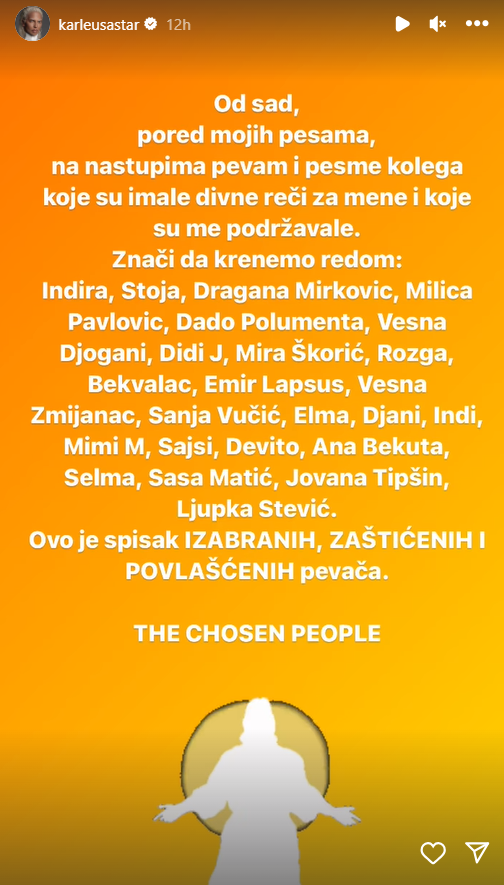 Она је на свом Инстаграм сторију објавила списак привилегованих и заштићених колега чије ће песме од сада уврстити у свој репертоар на наступима.