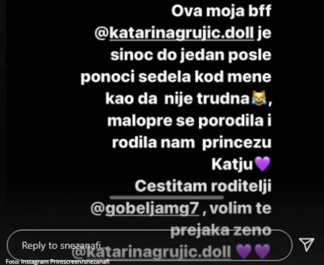 Ову вест је на Инстагарму поделила Снежана Борјан, која јој је честитала порођај.