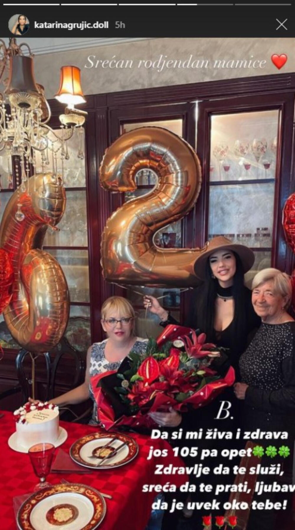 - Да си ми жива и здрава још 105 година па опет. Здравље да те служи, срећа да те прати, љубав да је увек око тебе - додала је Каћа.