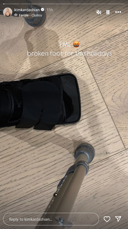Ким је у објави на друштвеној мрежи Инстаграм открила да је сломила стопало. Поделила је фотографију штаке на којој се придржава и ортопедске чизме, али није објаснила како се повреда догодила.