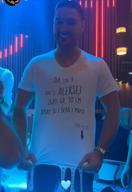 Он је одлучио да за ову прилику обуче мајицу са посебним натписом. На њој је писао: "Да, син је. Зове се Алексеј. 2680 гр, 50 цм. Добро су и беба и мама. Узми пелцер".
