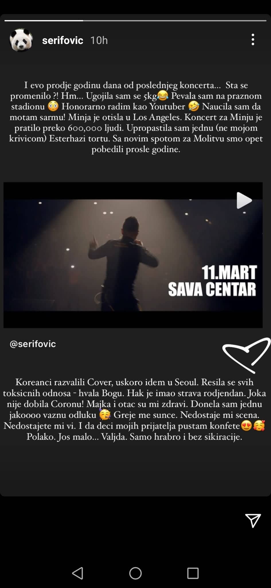 - И ево прође годину дана од последњег концерта. Шта се променило? Хм... Угојила сам се пет килограма. Певала сам на празном стадиону. Хонорарно радим као Јутјубер. Научила сам да мотам сарму! Миња је отишла у Лос Анђелес. Концерт за Мињу је пратило преко 600.000 људи.