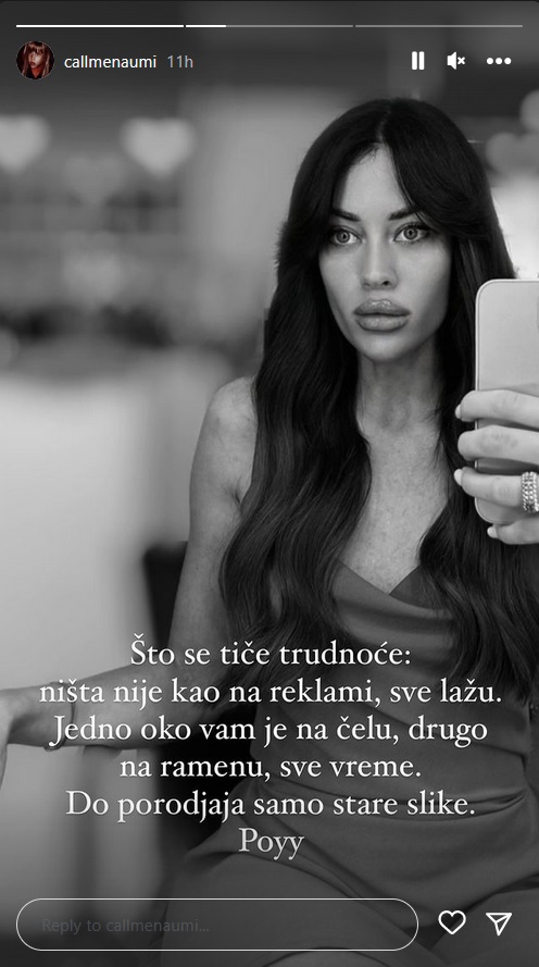 - Што се тиче трудноће, ништа није као на реклами, све лажу. Једно око вам је на челу, друго на рамену, све време. До порођаја само старе слике - написала је Мина у својој објави.